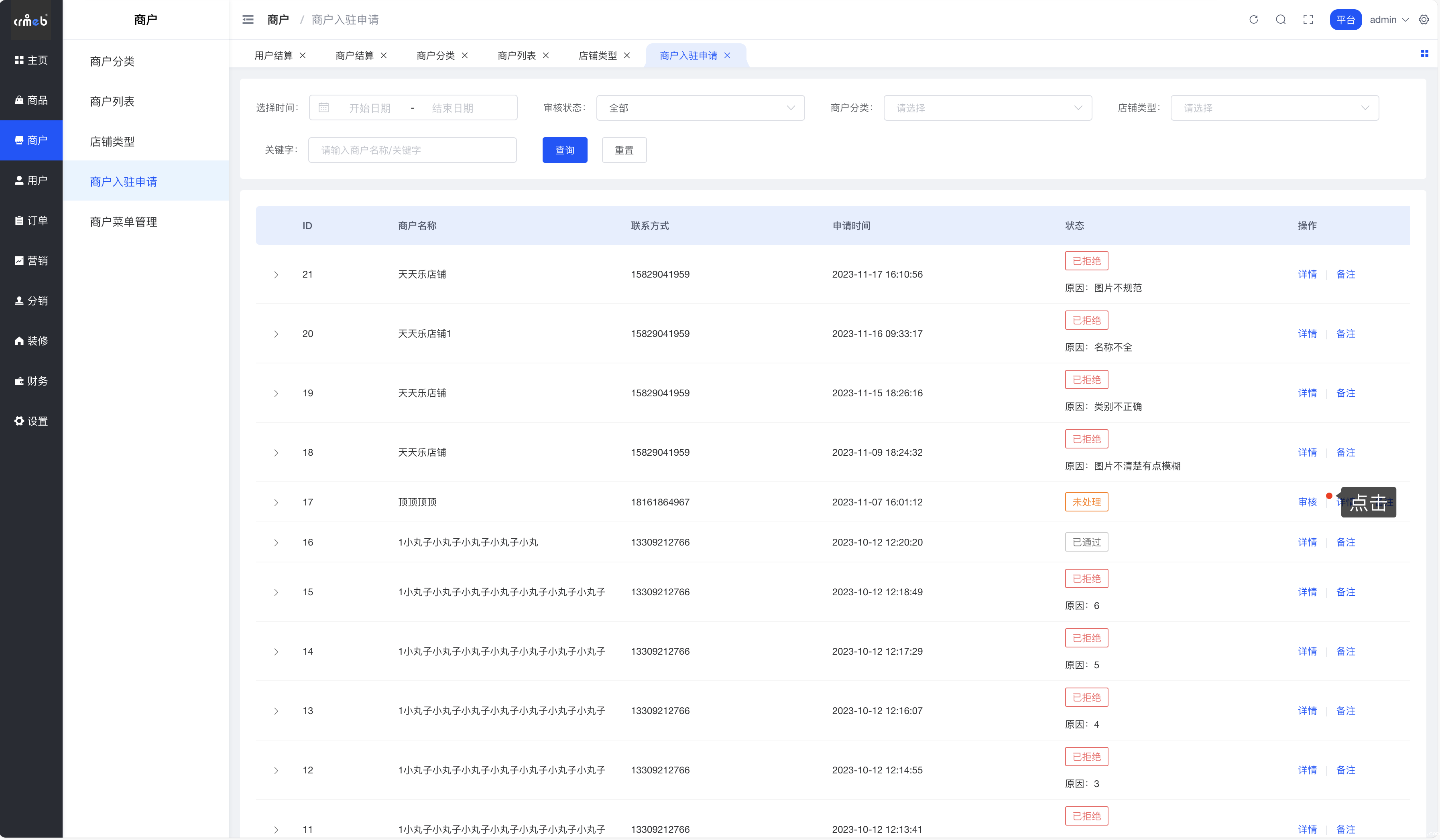 平台后台>商户>入驻管理