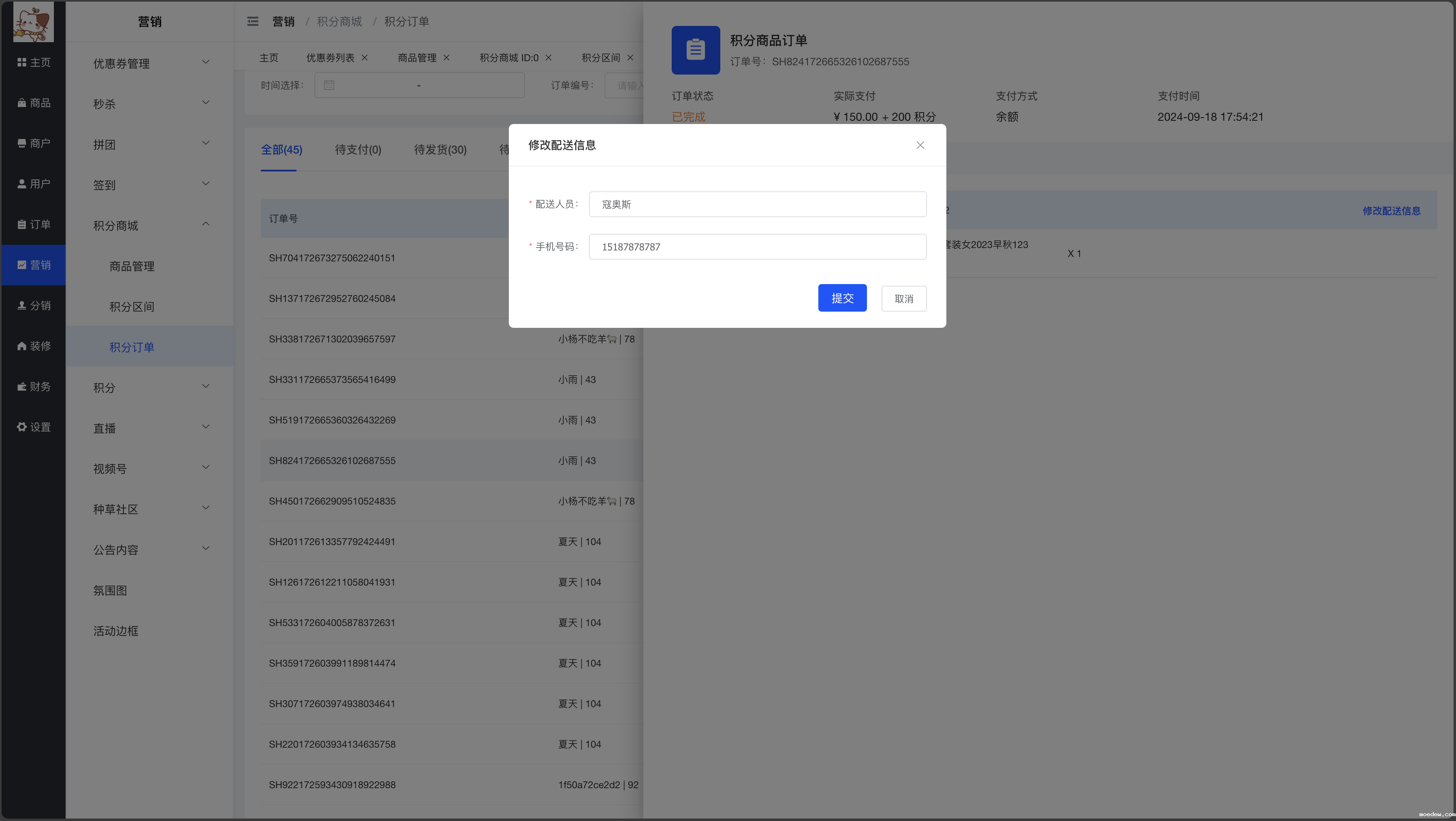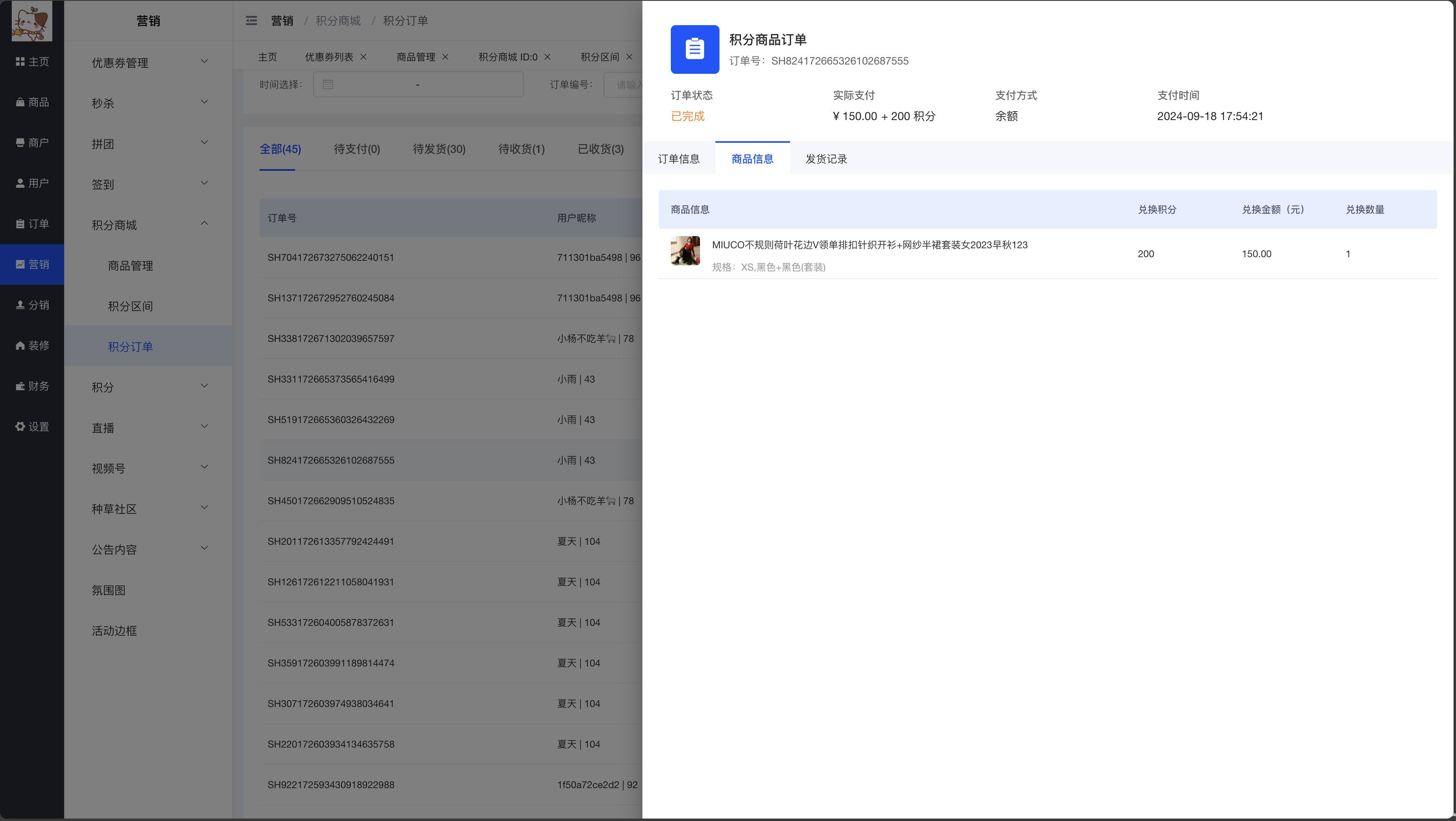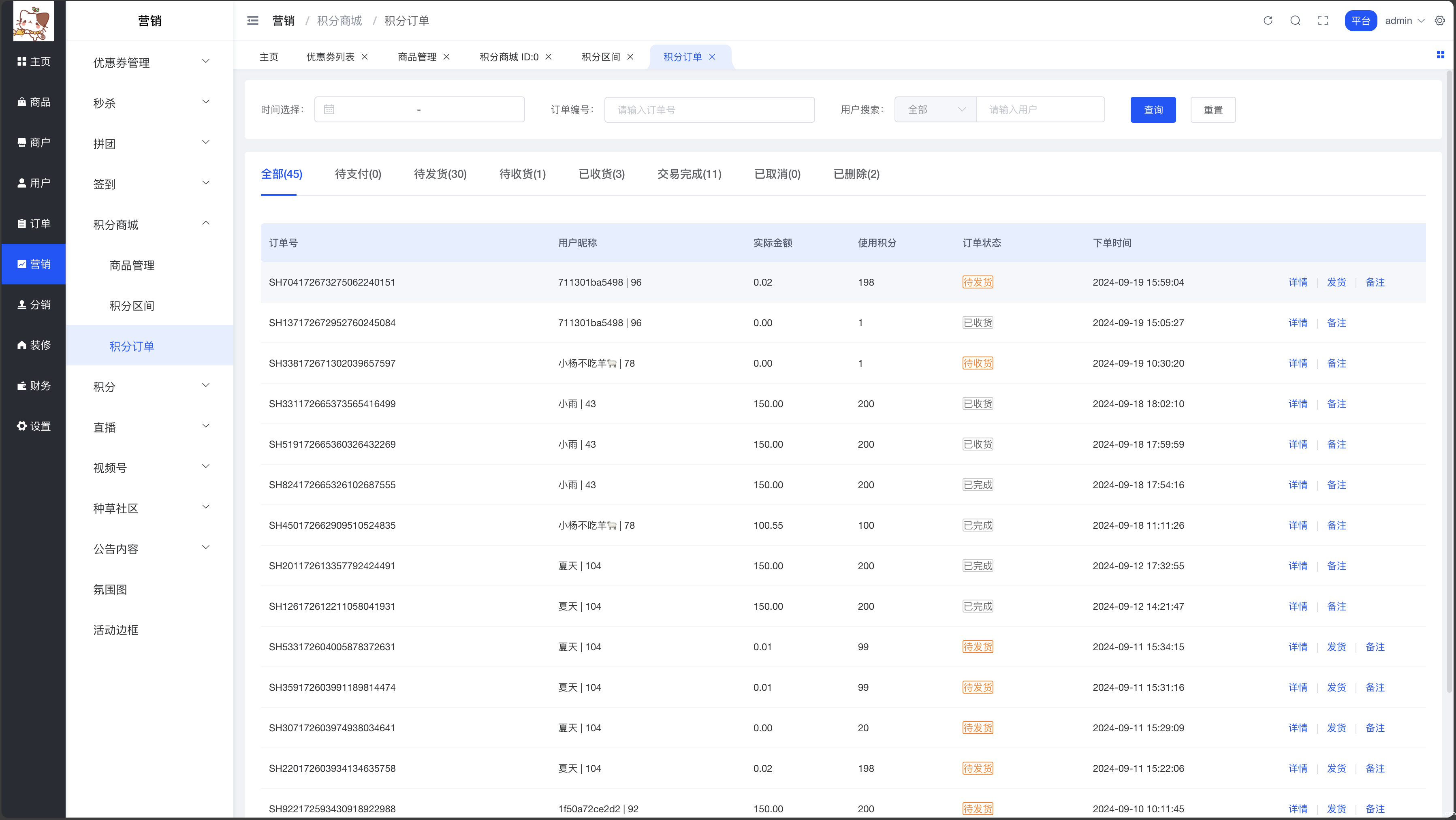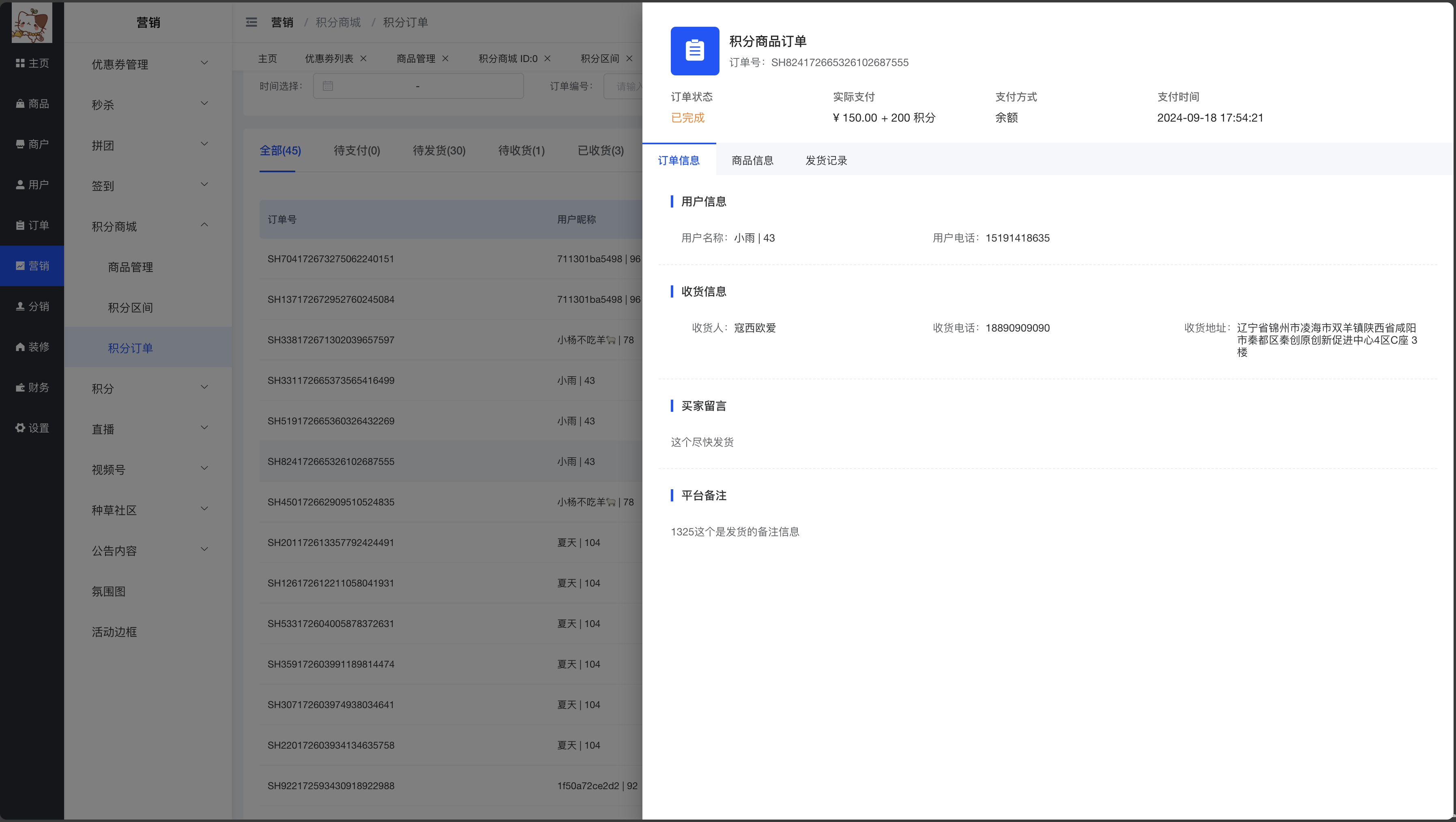 页面操作路径:平台端 > 营销 > 积分商城 > 积分订单