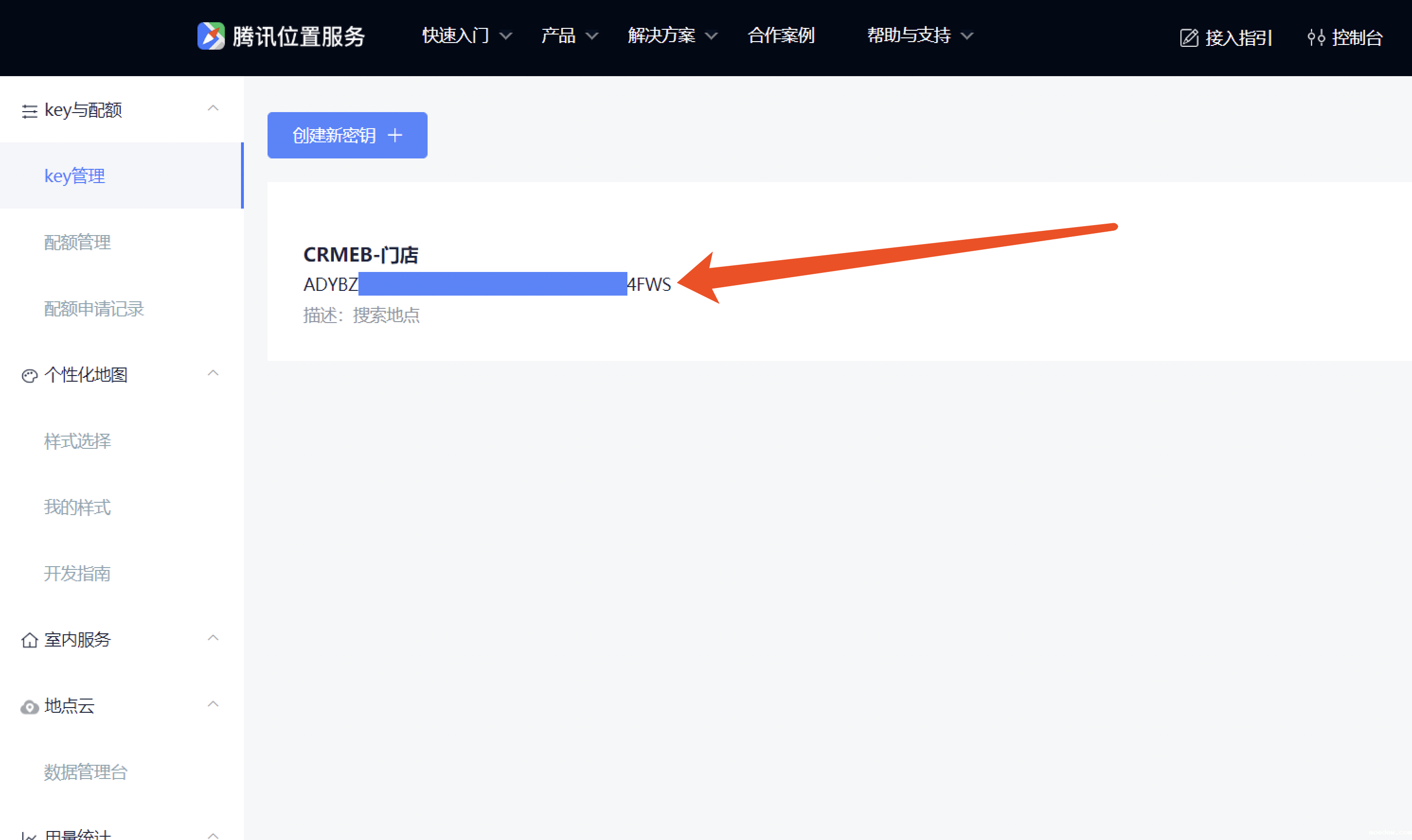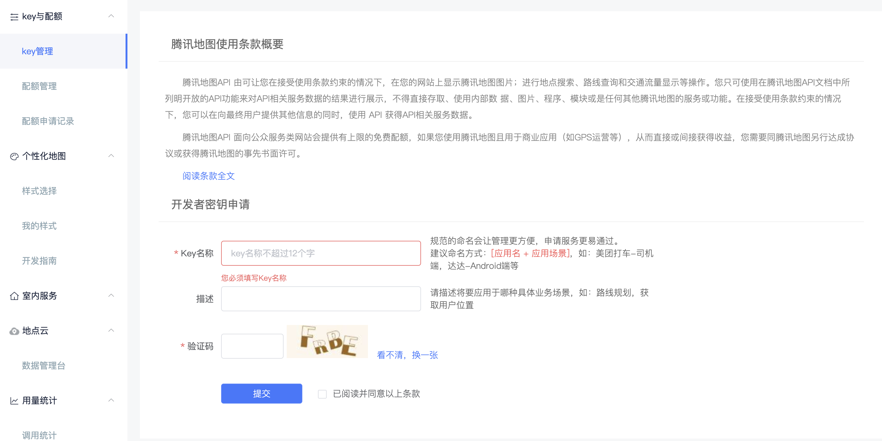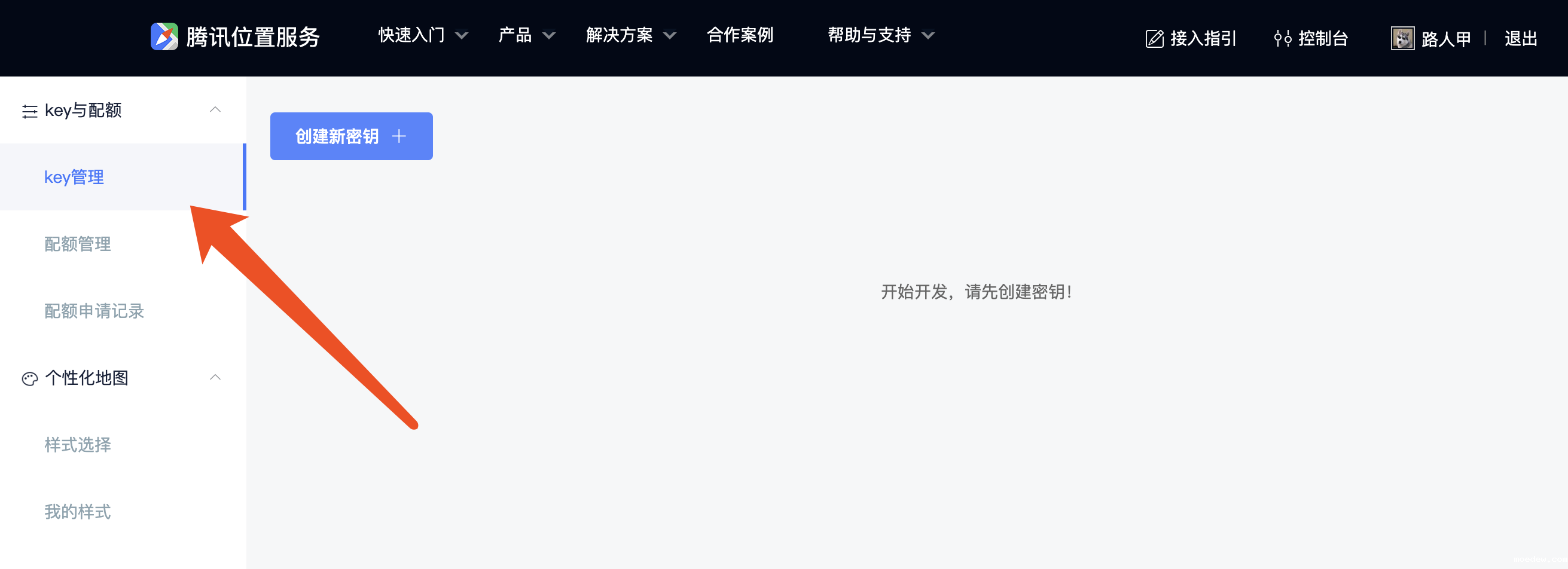 1、登录腾讯位置服务 > 进入控制台 > key管理