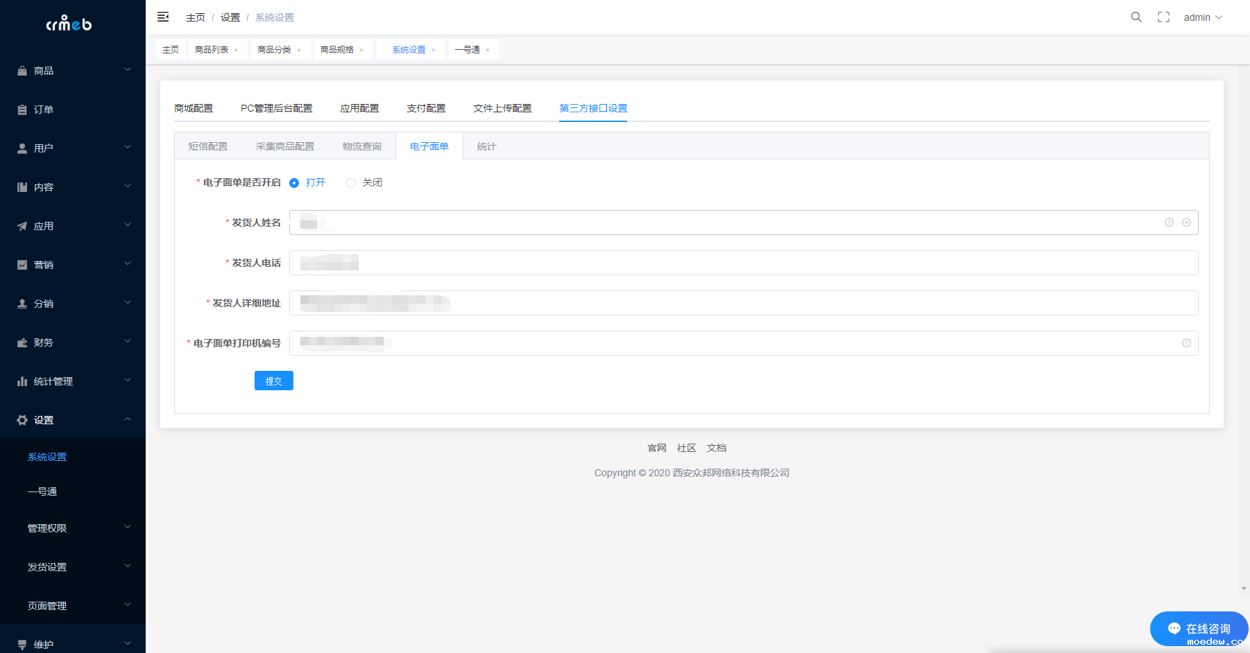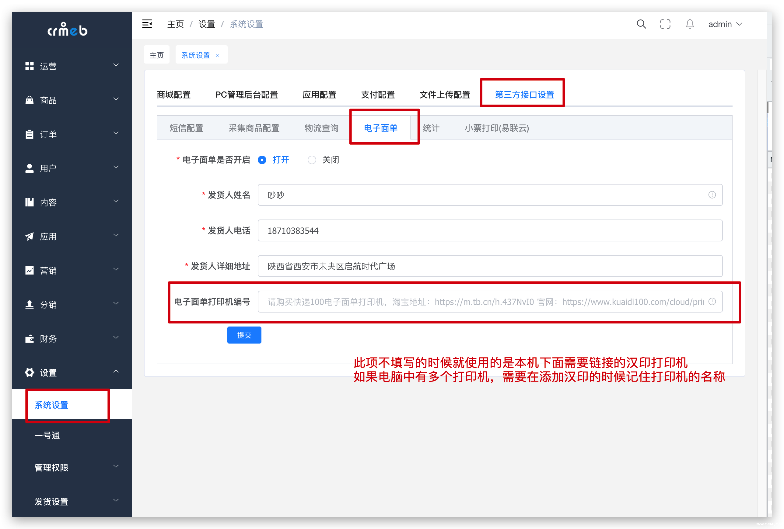 4)开通之后,可在 “设置 > 系统设置 > 第三方接口设置 > 电子面单“ 中修改发货信息、打印机编号