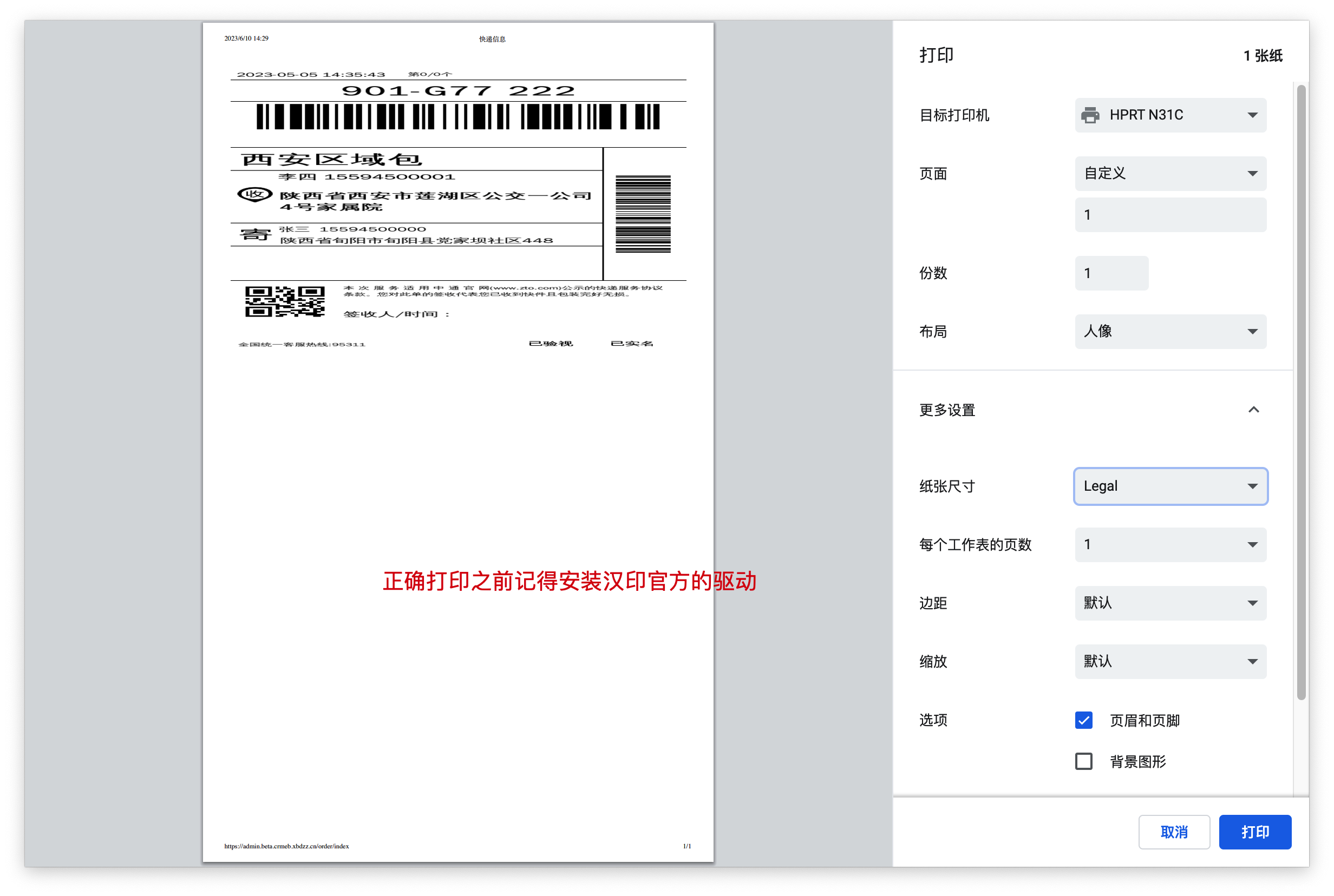 修改后即可和图1一样 删除打印机编号即可使用本机链接的 汉印打印机 打印电子面单