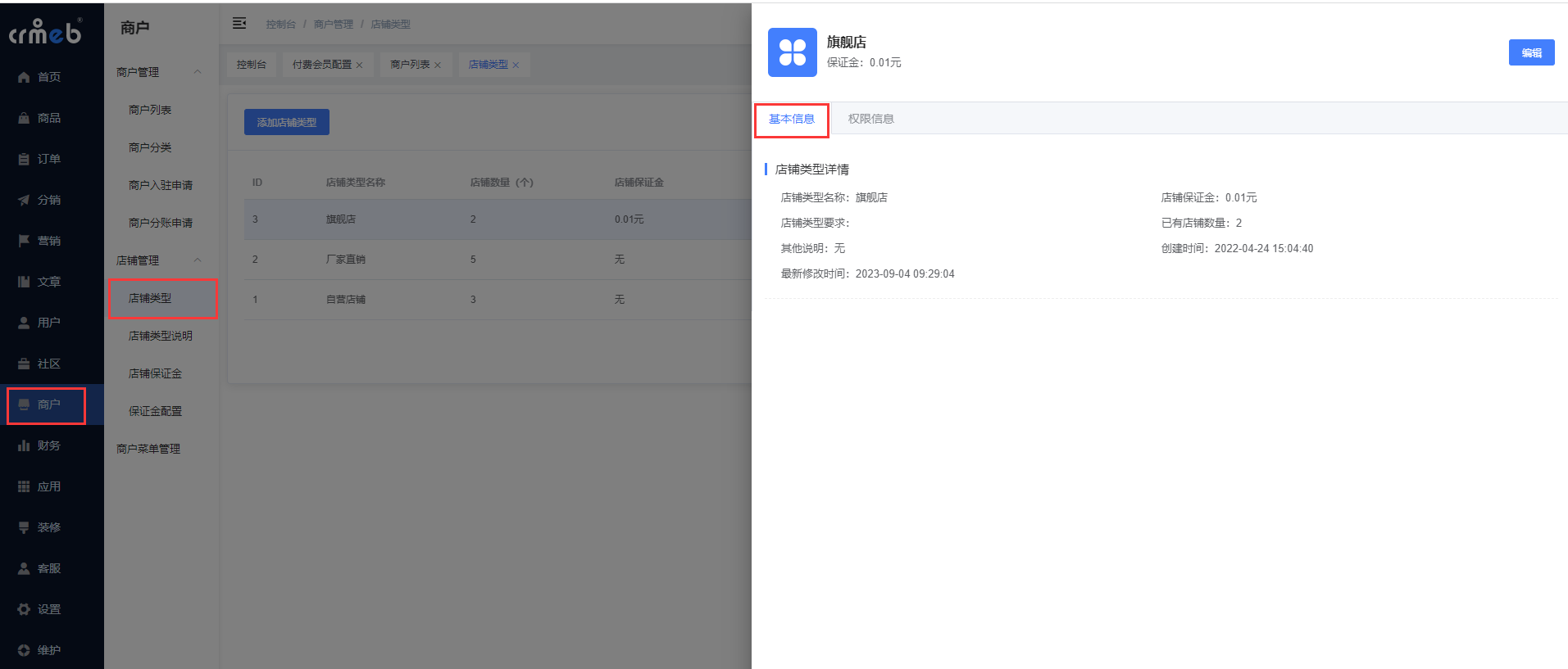 店铺类型是多商户商城系统特有的功能,CRMEB 多商户商城是一个商户对应一个店铺的模式,设置店铺类型,并根据不同店铺类型,设置店铺保证金与店铺权限,方便平台针对不同类店铺多样化运营。