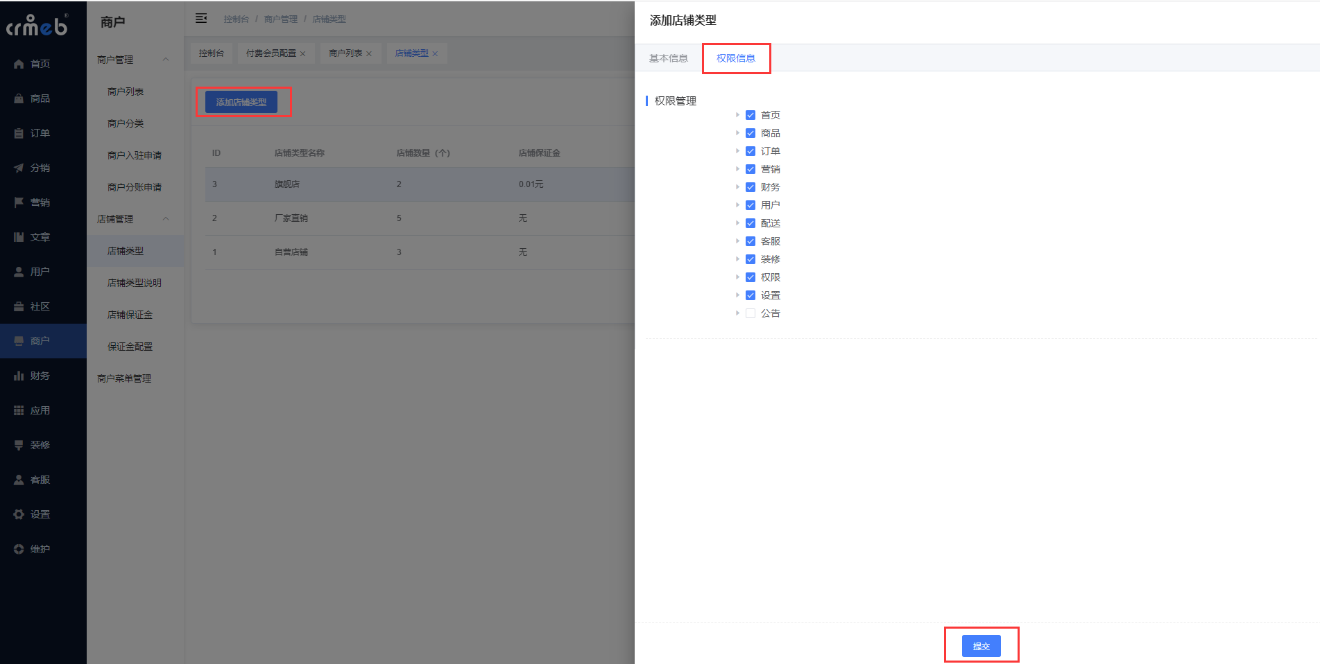 第一步:平台后台设置店铺类型、店铺保证金、店铺权限