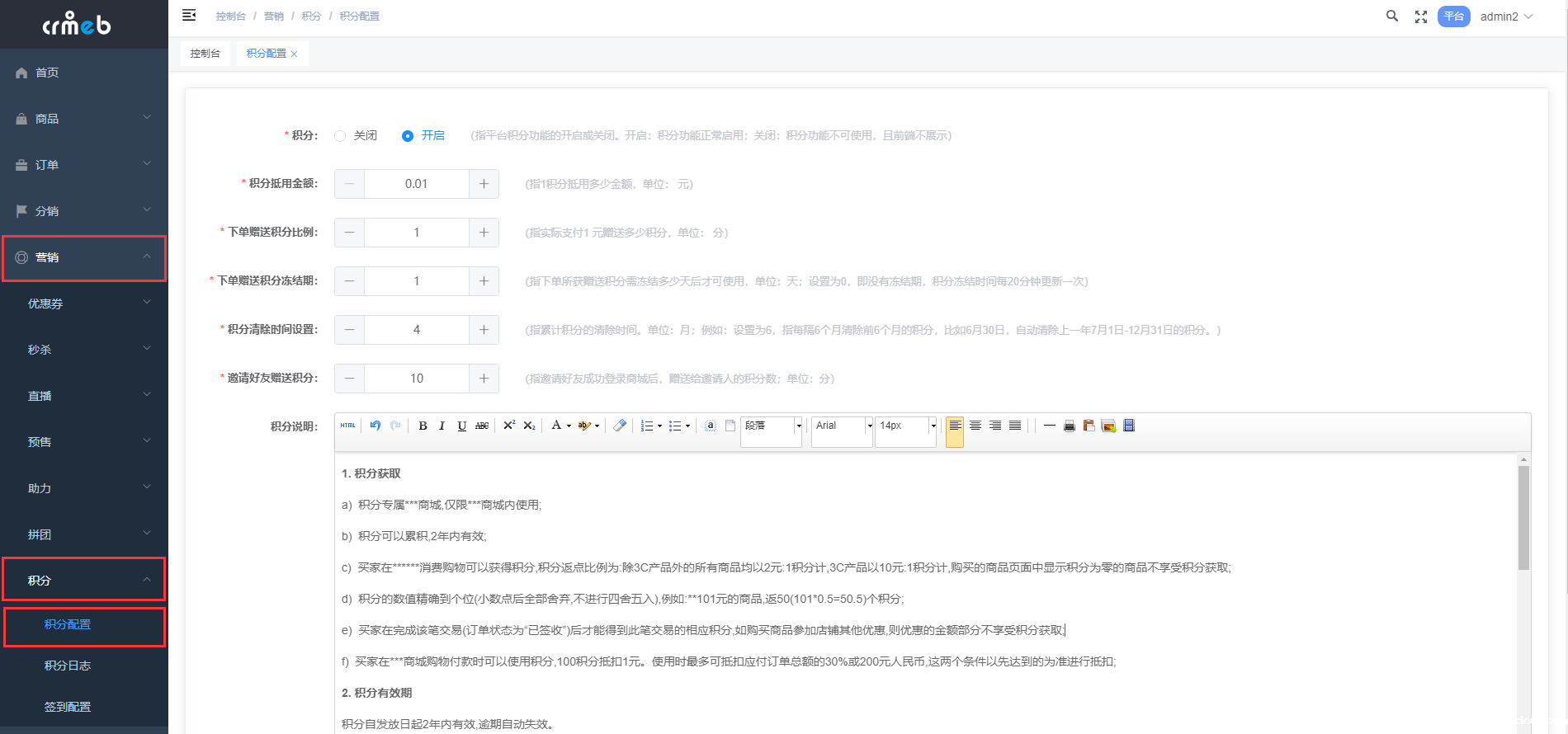 (1) 积分开启/关闭:指平台积分功能的开启或关闭,开启:积分功能正常启用;关闭:积分功能不可使用,且前端不展示,不影响布局。