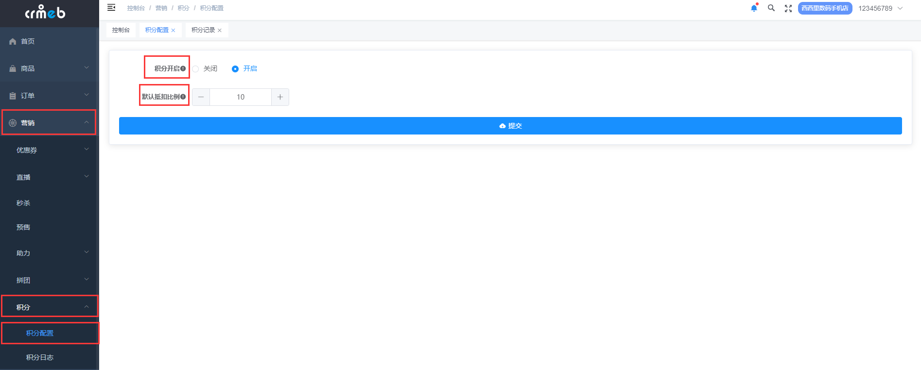 积分开启:开启:指商户开启商品使用积分抵扣,所产生的成本由商户承担;关闭:指商户的商品不使用积分抵扣。
