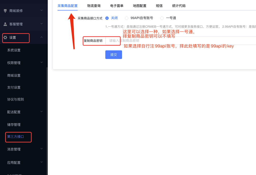 注意:选择一号通方式,此处复制商品密钥不填写;如果选择自行注册99api,下图位置填写99API密钥。