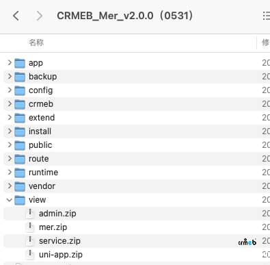 二、打开完整安装包,一定是完整安装包,例如名字为:CRMEB_Mer_v2.0.0(0531).zip