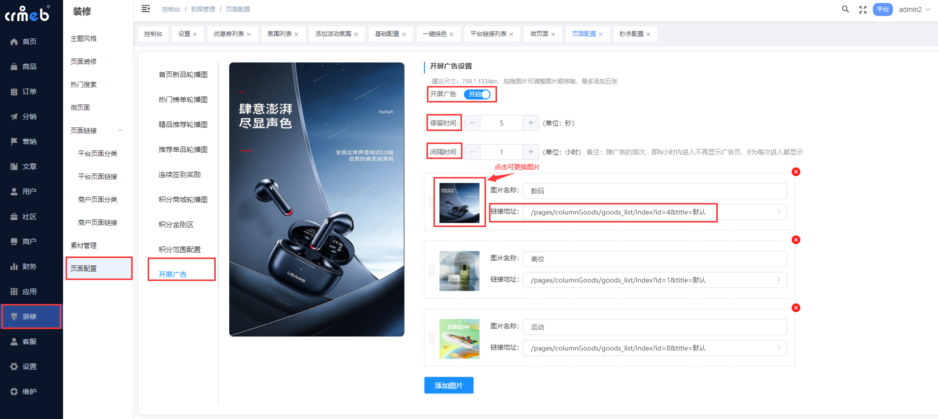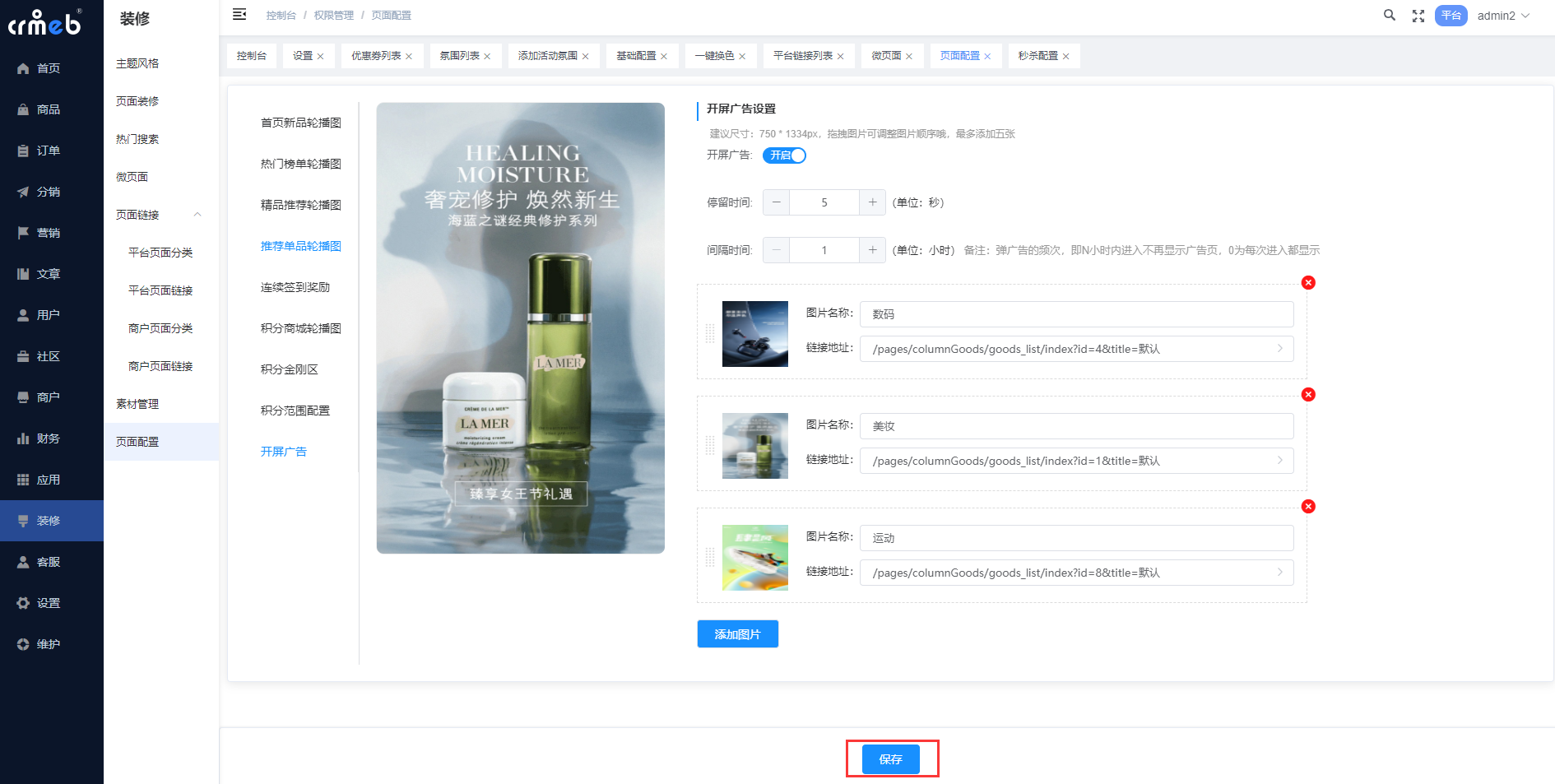 页面可视化设置,可方便运营操作,直观查看设置效果,提高商城搭建效率。 CRMEB 多商户v2.2 页面设置包括:首页新品轮播图、热门榜单轮播图、精品推荐轮播图、推荐单品轮播图、连续签到奖励、积分商城轮播图、积分商城金刚区、积分范围配置、开屏广告。