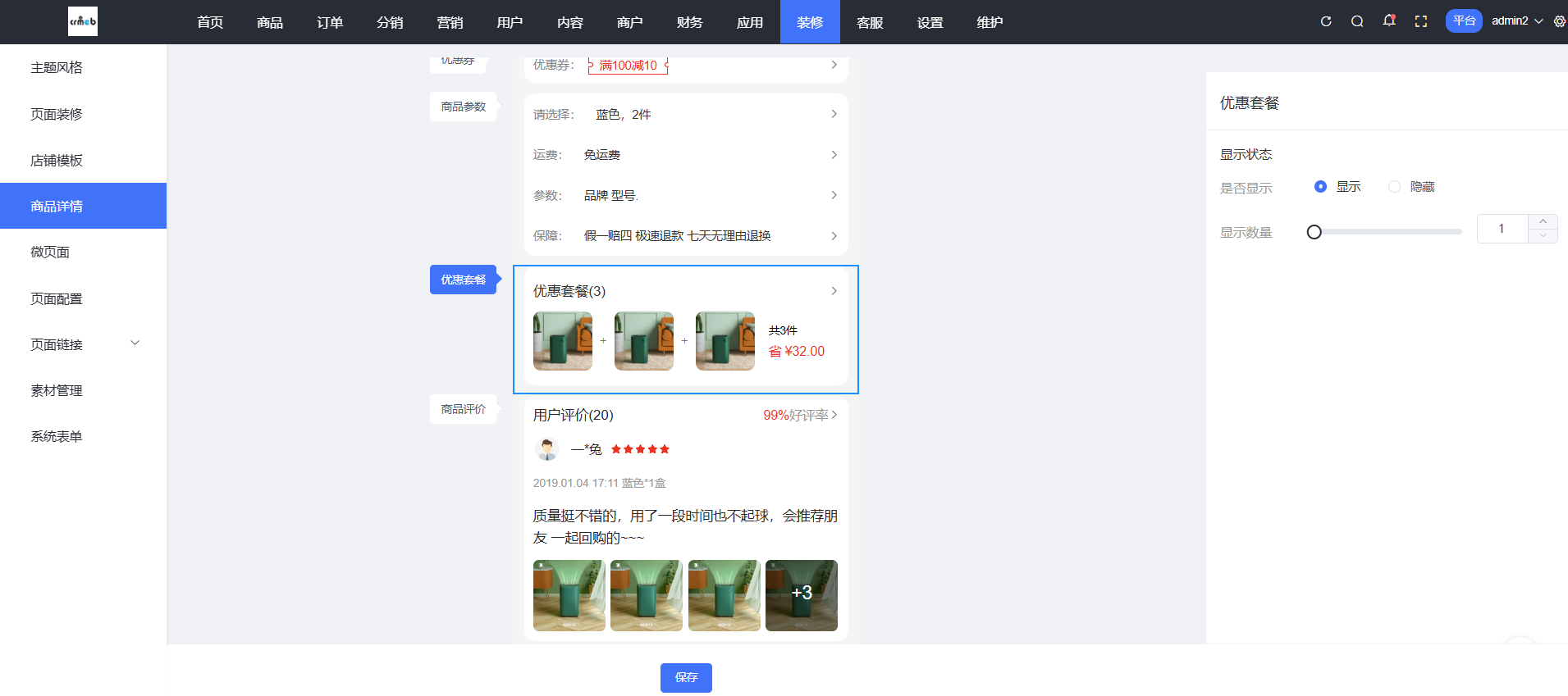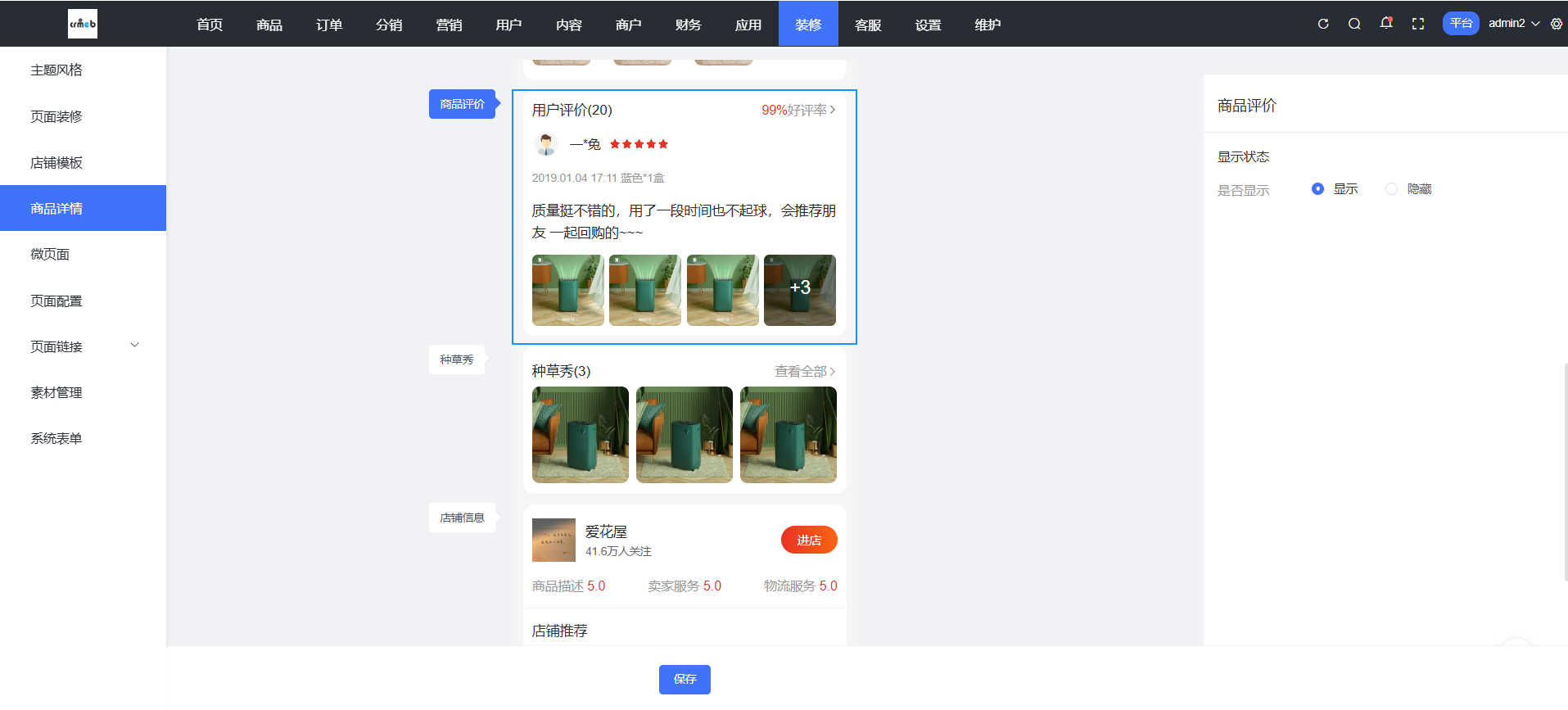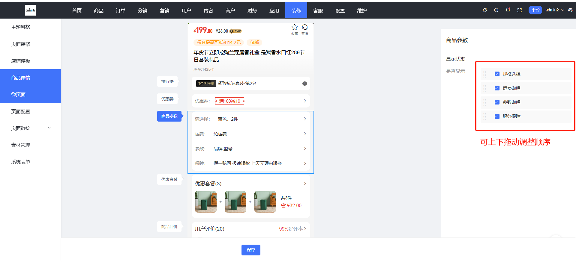 商家可调整商品详情各板块样式,可根据不同的需求开启或关闭单独的板块