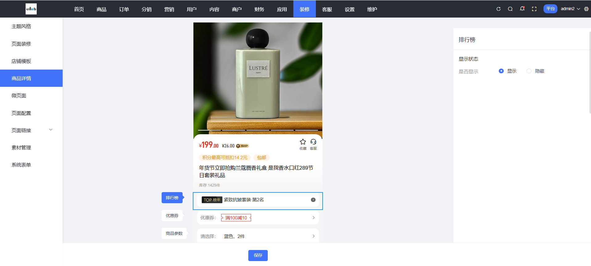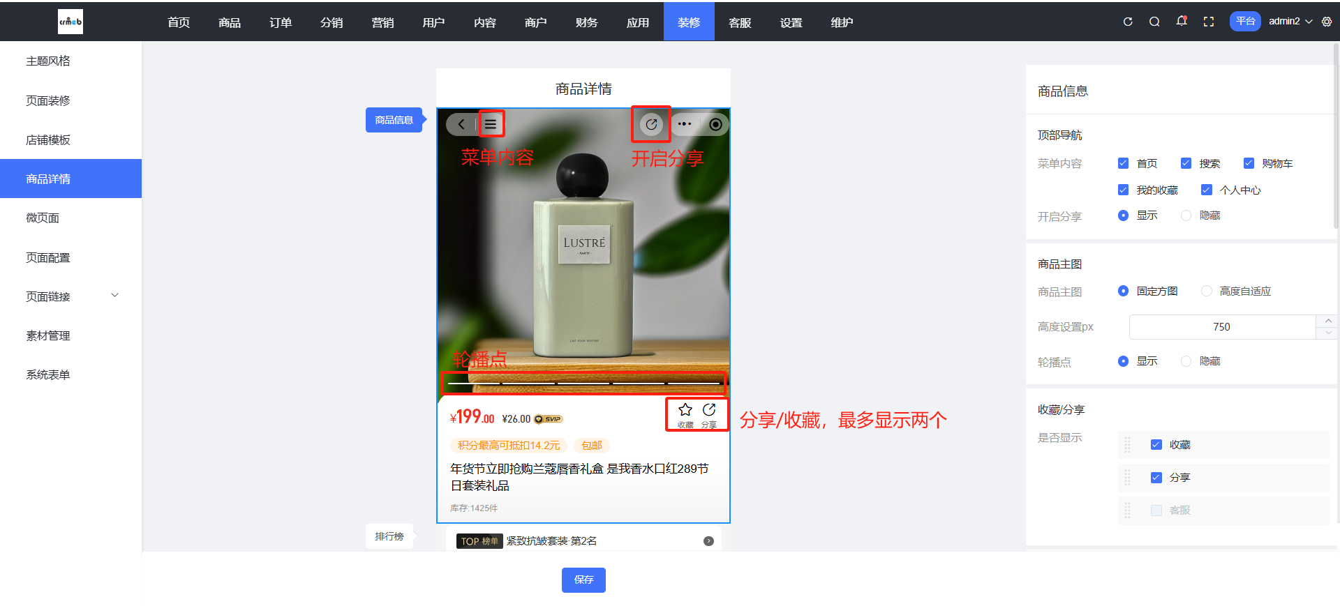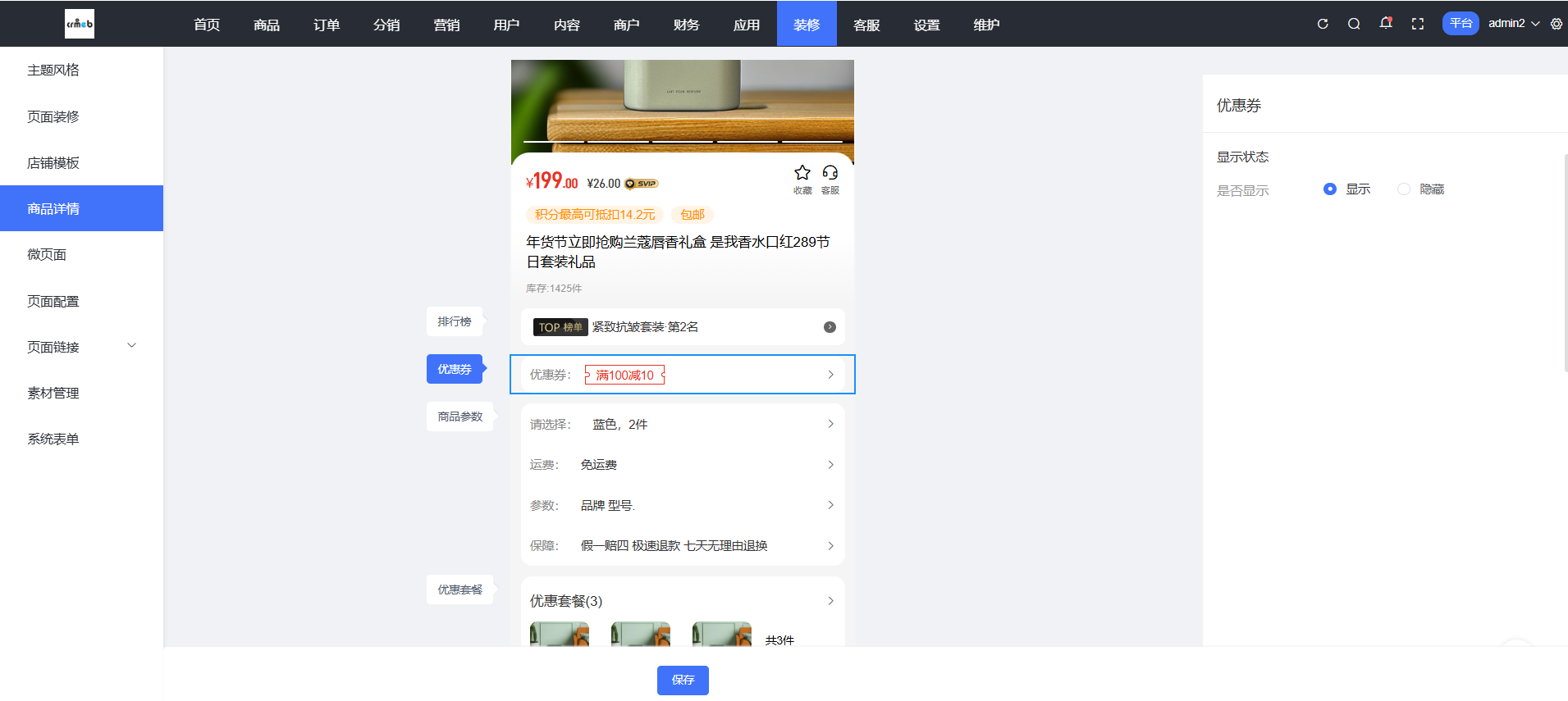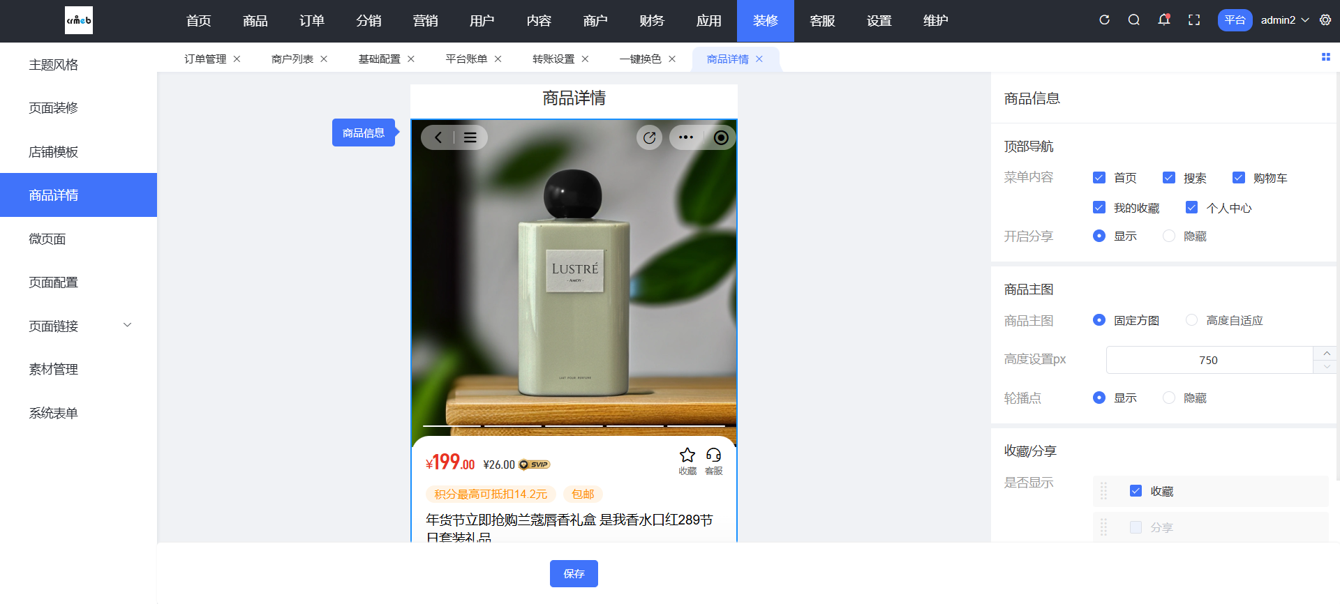 商家可调整商品详情各板块样式,可根据不同的需求开启或关闭单独的板块