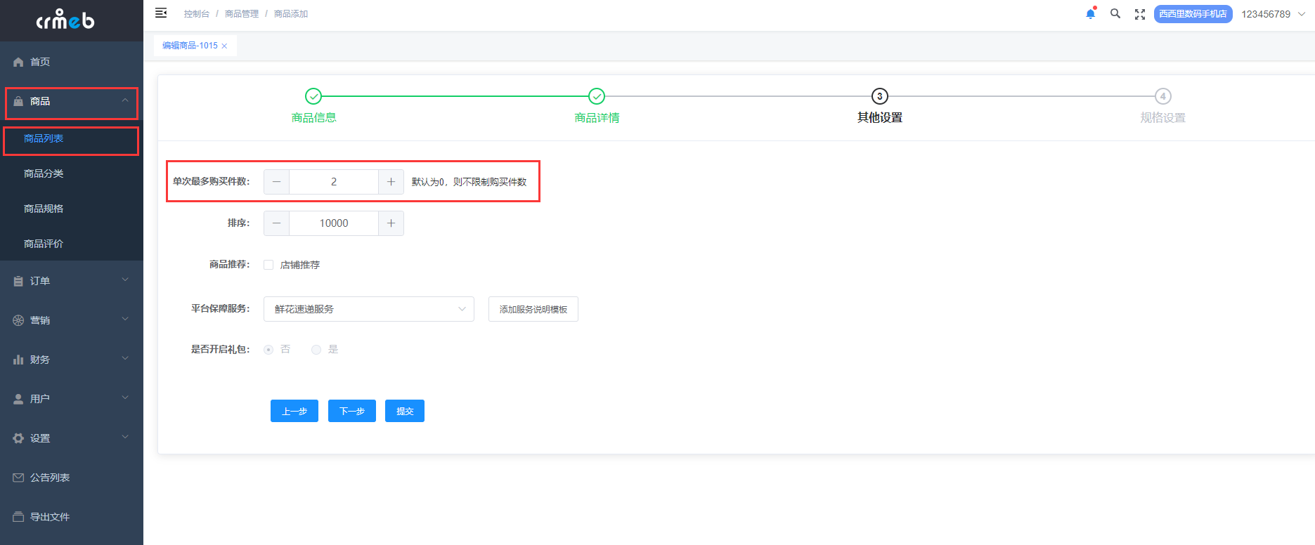 普通商品限购设置:限购具体规格,默认0 为不限购