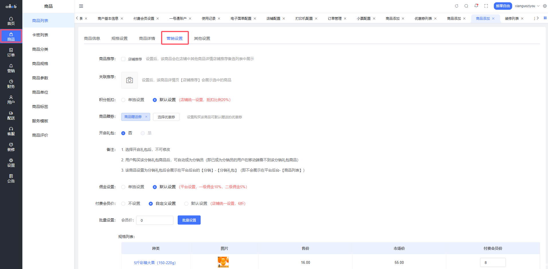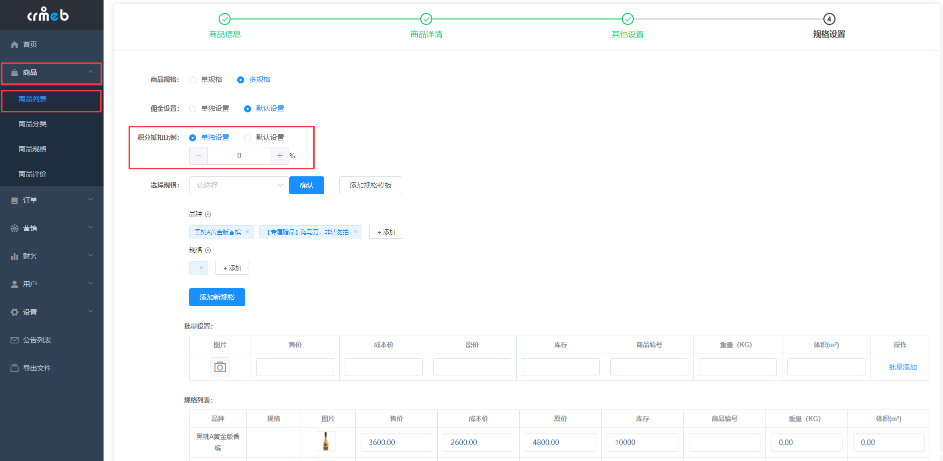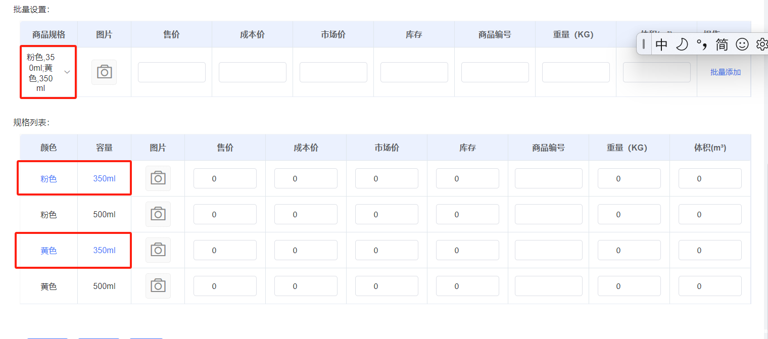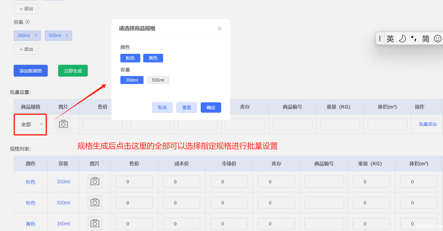 (3)规格生成后,可以点击批量设置这里的商品规格,对指定规格进行批量修改