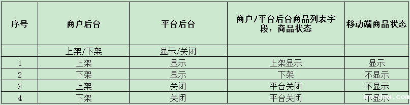 4当商品下架后,无论平台开启或关闭,移动端均不展示该商品;当商品上架时,平台如果关闭,该商品不会展示在移动端;