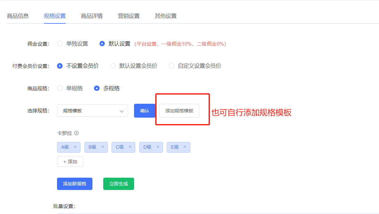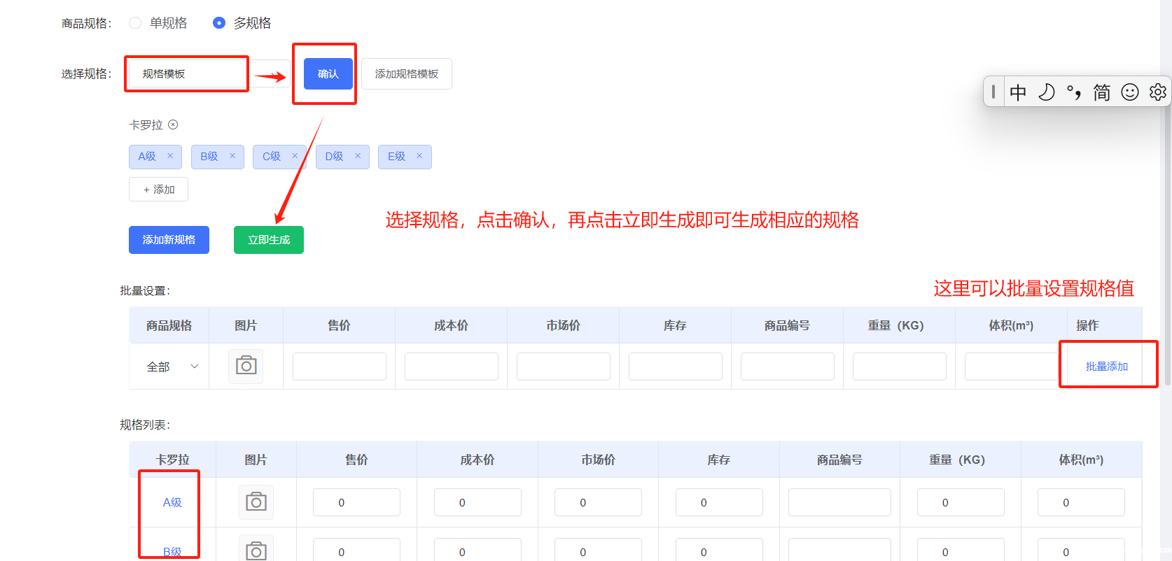(2)用户可添加新规格,添加完成后再规格模板的下拉里面选择新添加的模板,点击确认再点立即生成,即可生成相应规格