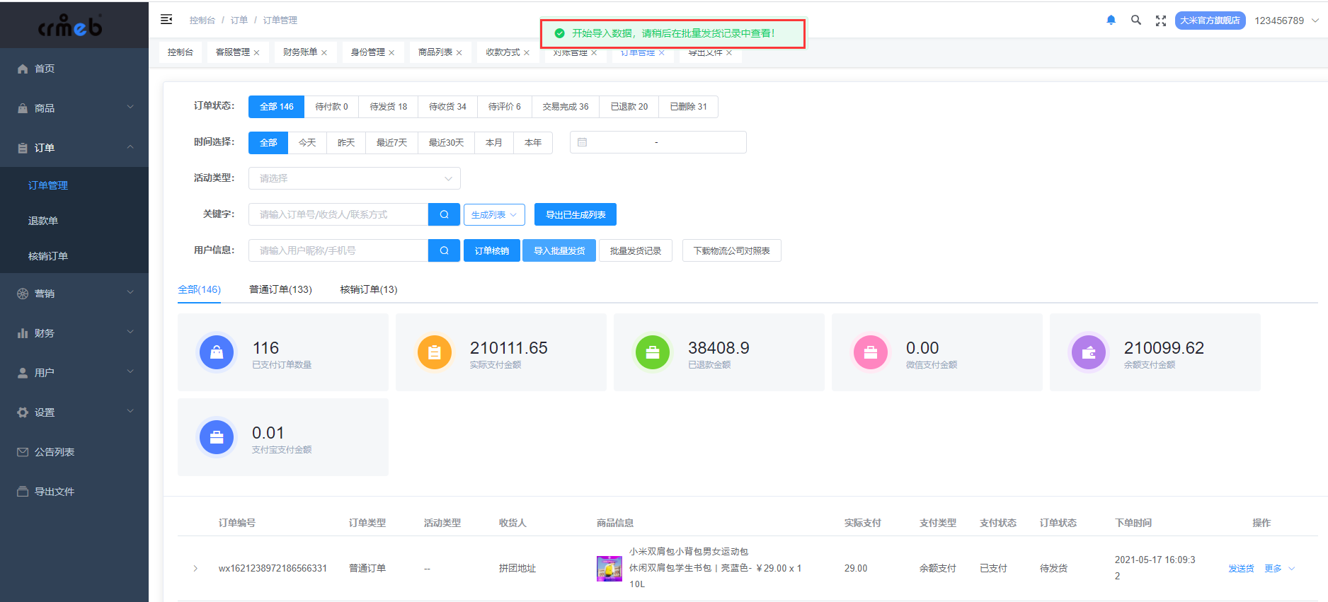 发货 : 包括手动单个发货、手动批量导入发货、电子面单发货