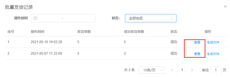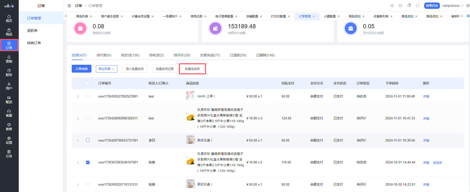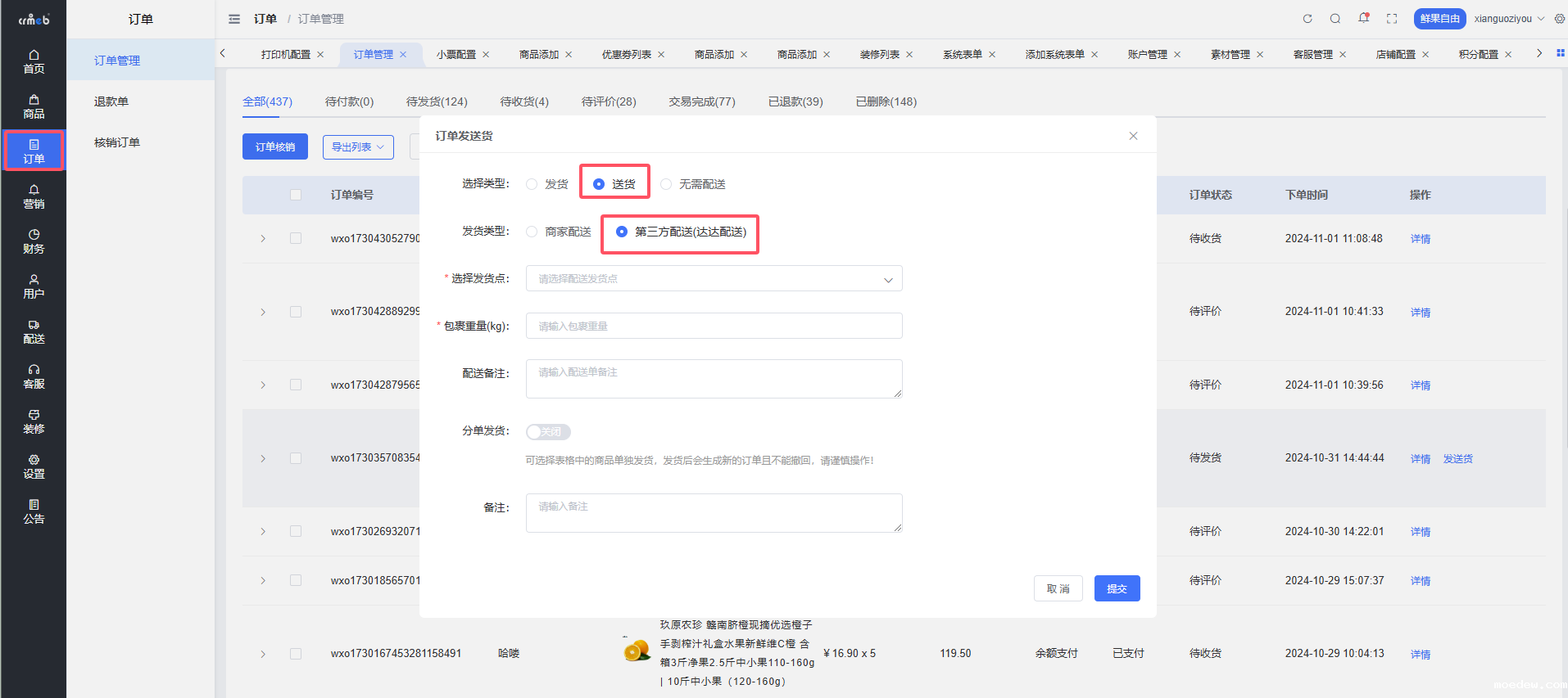 按如上操作设置好后,在订单列表选择订单-点击发送货或选择订单-点击批量发货