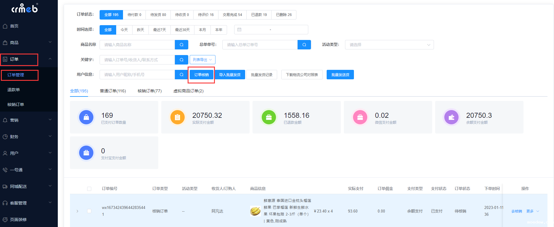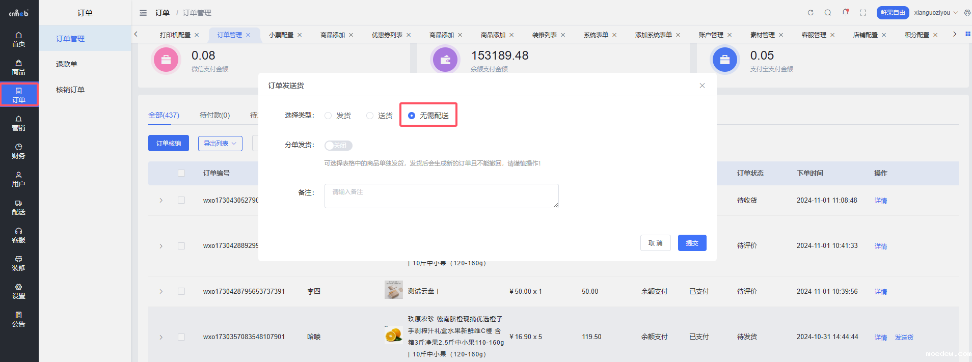 订单发货: 此处订单发货主要介绍在商家管理后台订单管理模块种的订单发货,包括单个订单发货、导入批量订单发货、电子面单发货、分单发货、虚拟发货、同城配送发货、订单核销。