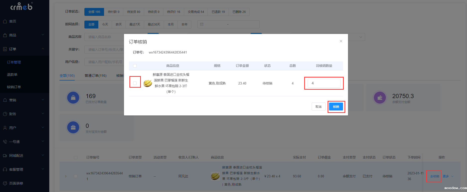 说明:v2.1版本开始可多件商品多次核销,每核销1次独立拆分了订单。