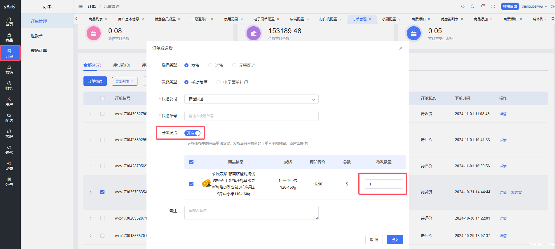 (3)分单发货后,分出的订单会生成全新的订单,订单号在原订单号基础上会加“-1”、“-2”……;