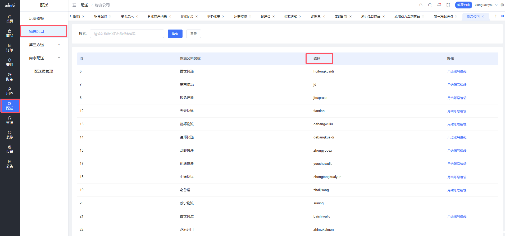 物流编码信息可提前在商户后台>配送>物流公司 列表查询