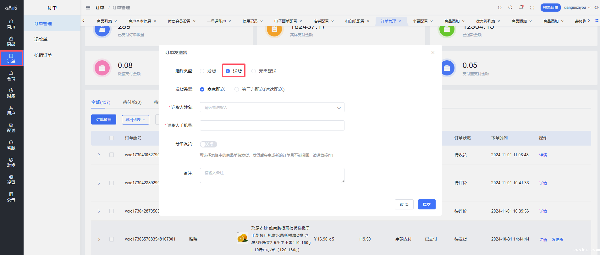 商家配送需提前添加配送员;第三方平台配送对接了UU和达达配送,需平台和商户提前配置(操作文档:https://doc.crmeb.com/mer/mer2/4537)