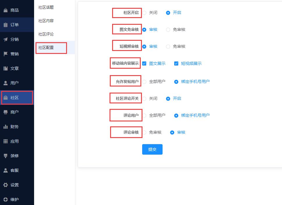 1.社区开启: 开启,此功能才能正常使用,关闭则不能正常使用,默认开启;