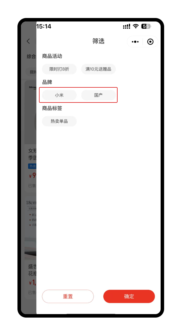 移动端选择商品分类或搜索商品关键字后,页面右上角会展示“品牌”,系统会自动读取结果中商品已关联的品牌,点击品牌名称可进行品牌筛选。