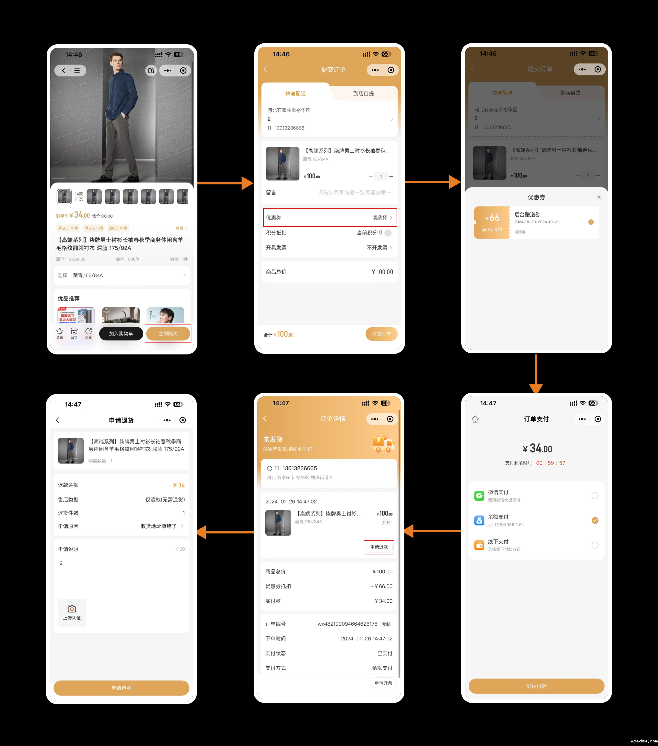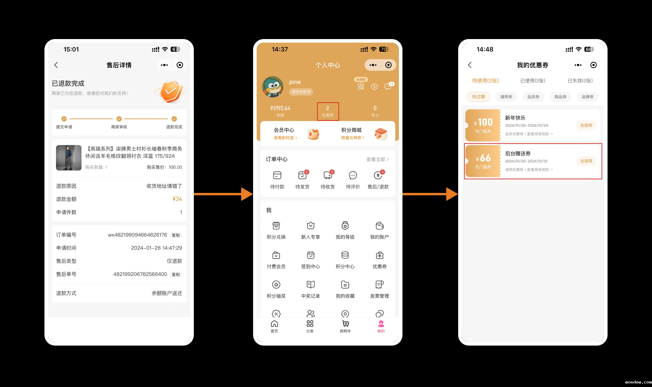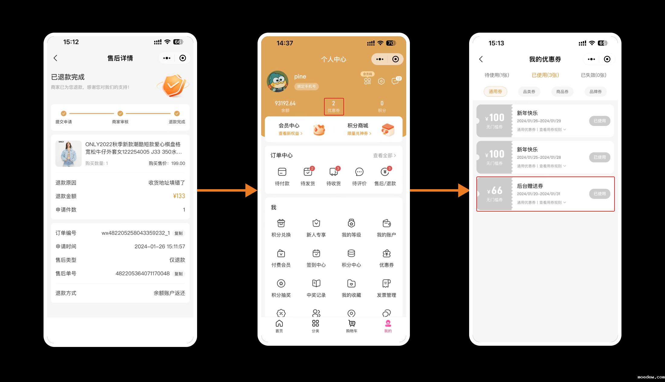 下单时使用优惠券,整个订单申请退款,商家同意退款后,优惠券退回至用户账户。