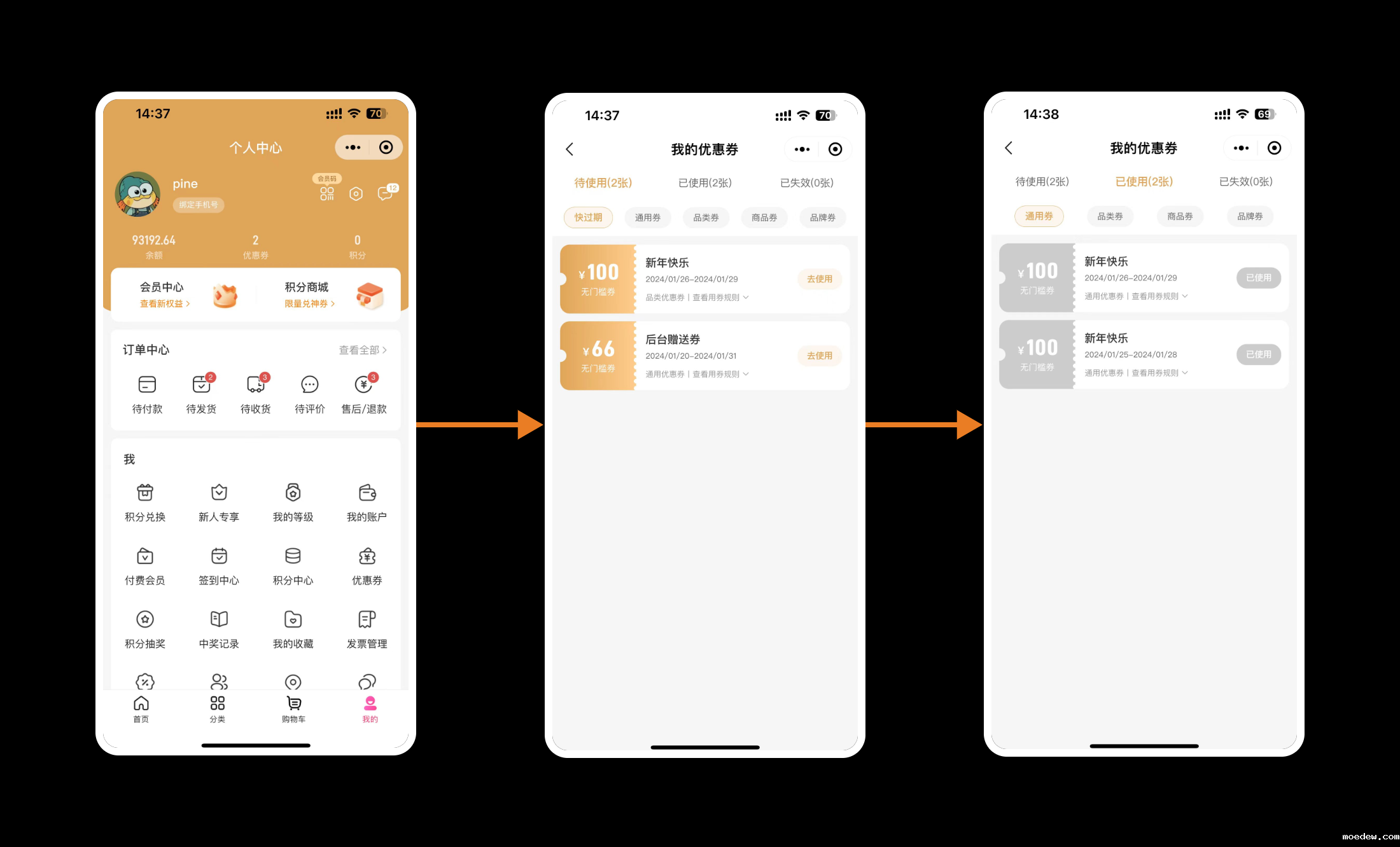 在个人中心—>优惠券内查看可使用和已过期的优惠券