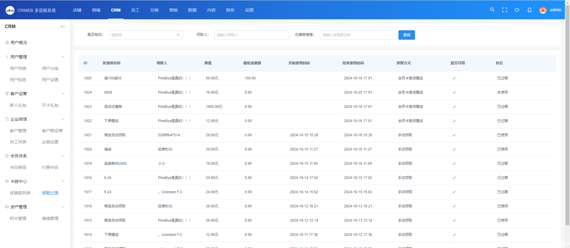 可通过优惠券是否有效,领取人以及优惠券名称查询领取记录