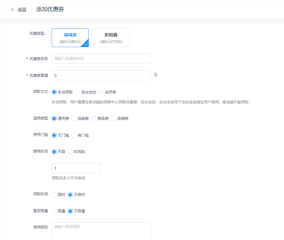 后台发放:用于后台发送给指定用户或商品营销活动中赠送,移动端不能领取
