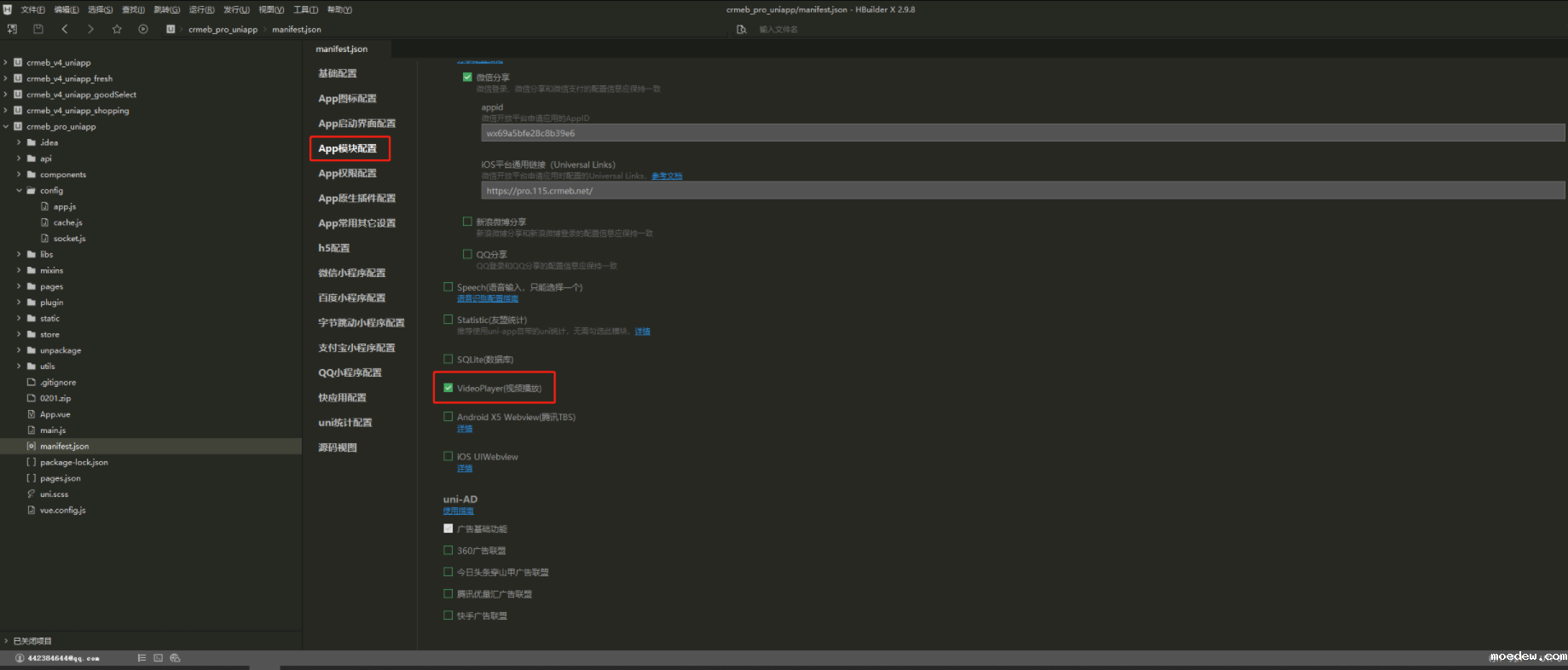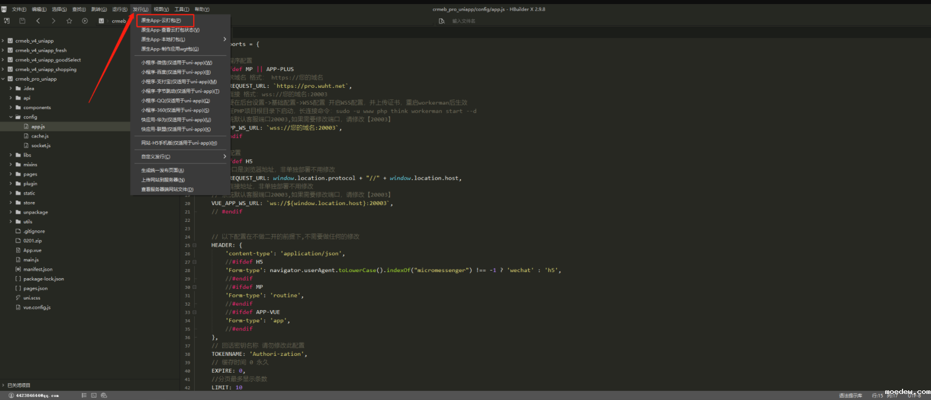 1.打开uni-app下config/app.js修改接口地址,将下图两个地址修改成您的域名