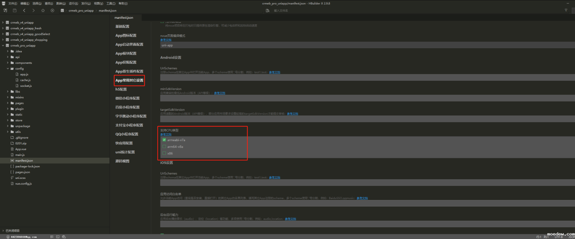 5.点击《App常用其他配置》,勾选《支持CPU类型》下的armeabi-v7a