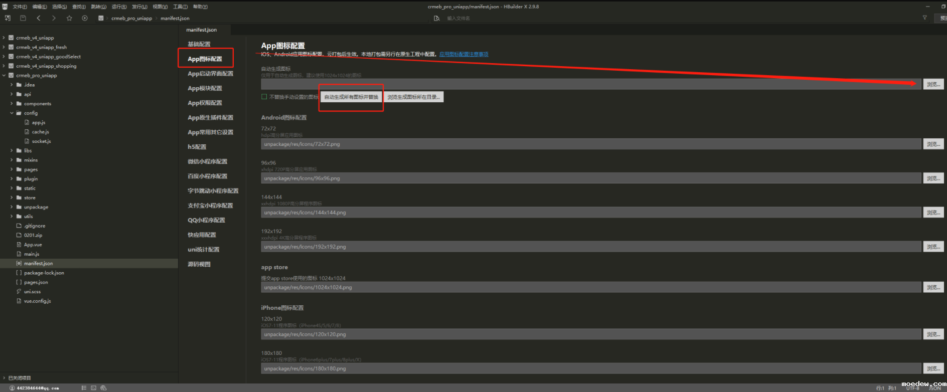 2.点击《App图标配置》,上传APP的图标文件,点击《自动生成所有图标并替换》
