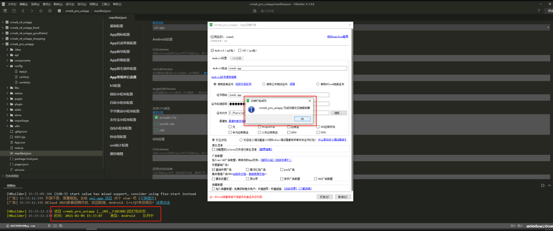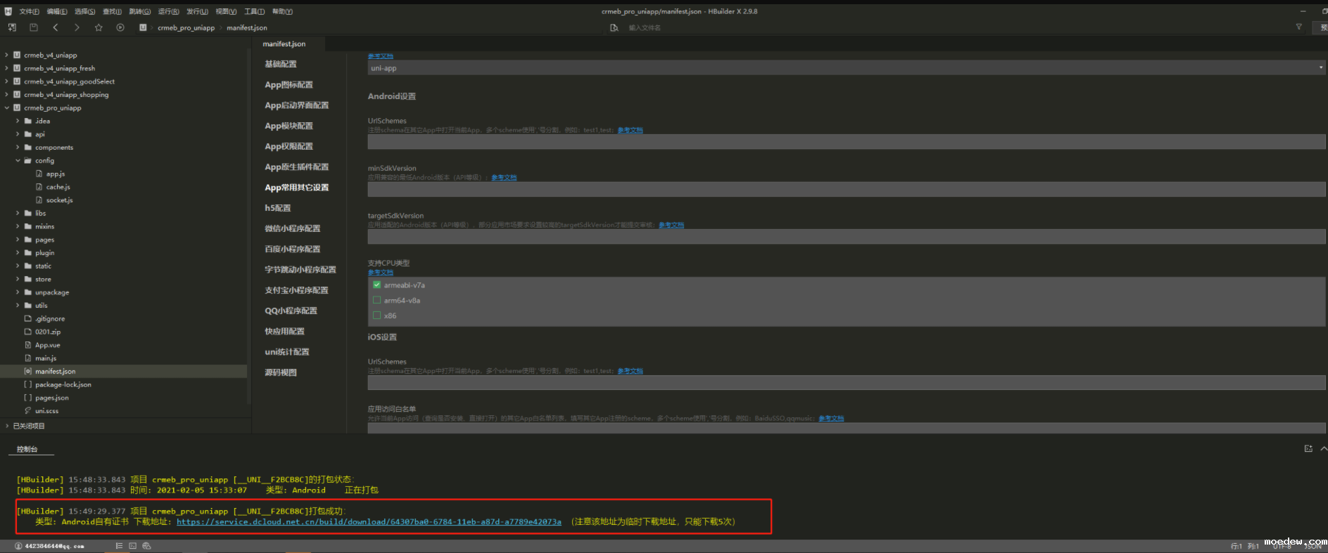 3.点击左下方打包,等待进度条完成后点击确定,等待打包完成,下载APP包即可