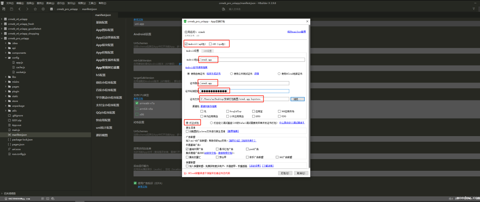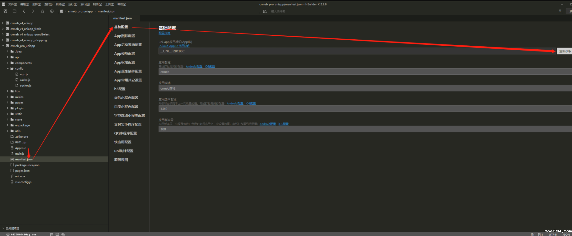 1.打开 uni-app 根目录下的 manifest.json 文件, 点击《基础配置》,重新获取 uni-app应用标识,获取之后填写 应用名称,应用描述,应用版本名称,应用版本号