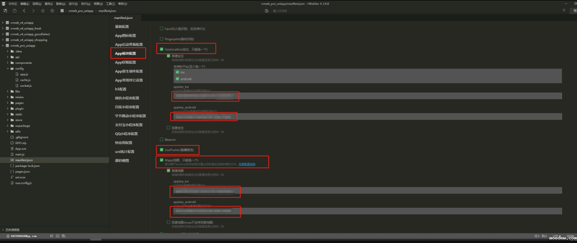 3-1. 选择《Geolocation》,在《高德定位》和《百度定位》中选择一个,填写appkey_ios 和 appkey_android