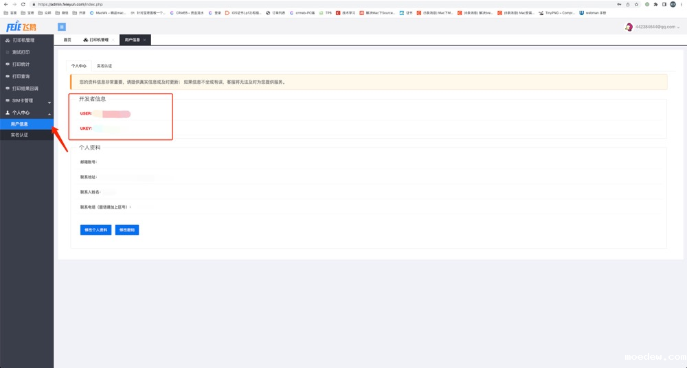 左侧个人中心进入用户信息,获取开发者信息