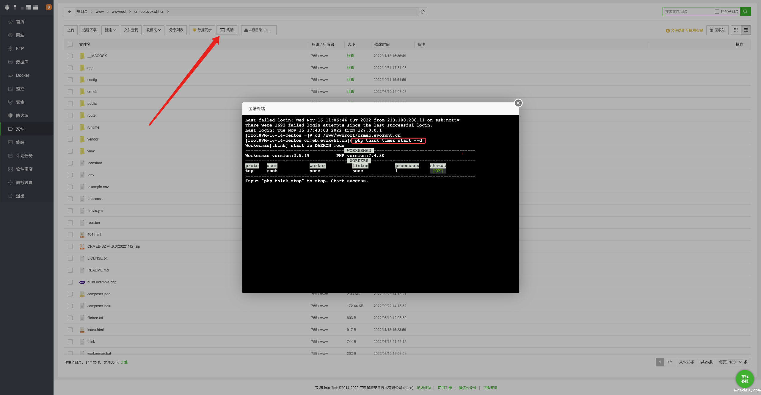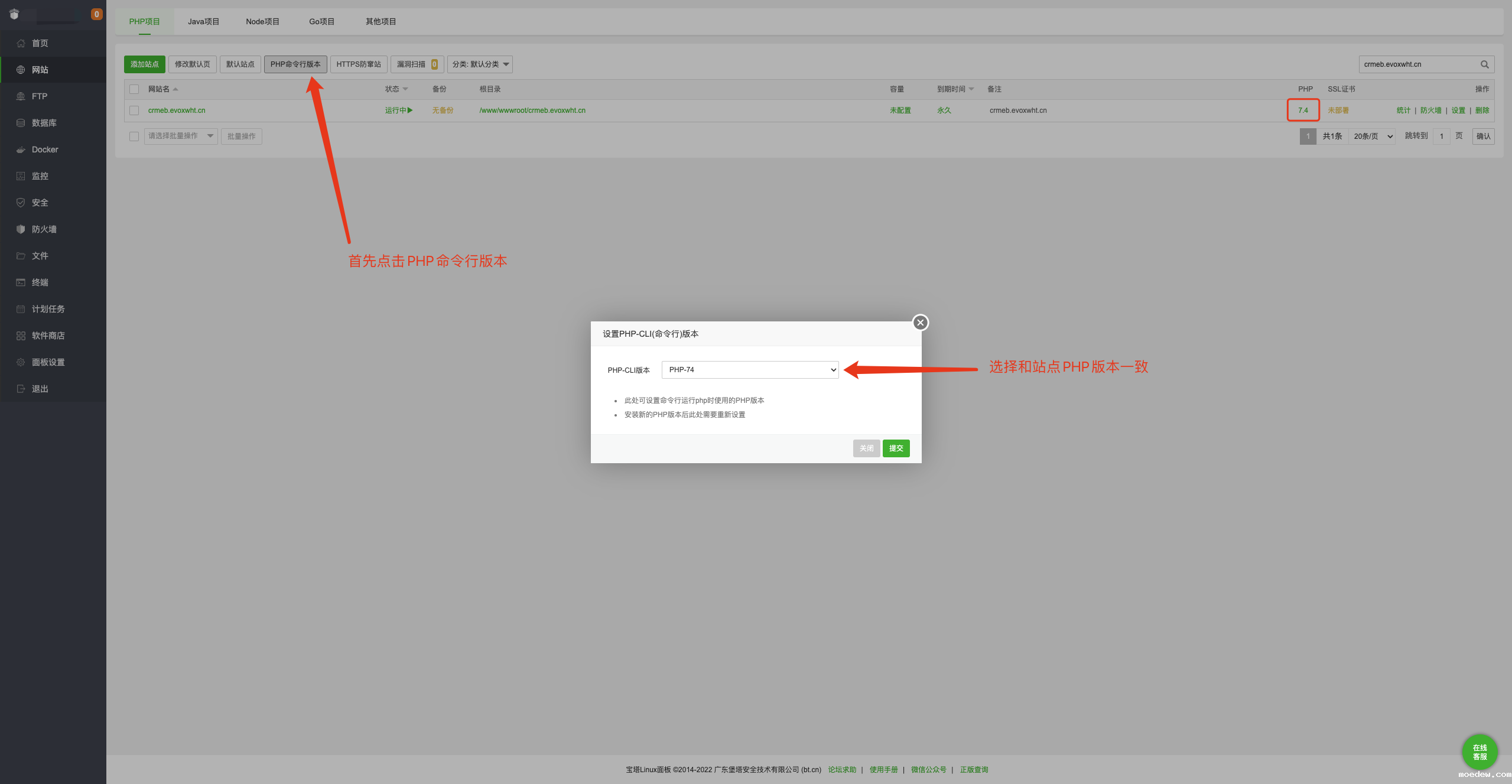 1.修改宝塔命令行的PHP版本,将命令行的PHP版本和站点的PHP版本保持一致