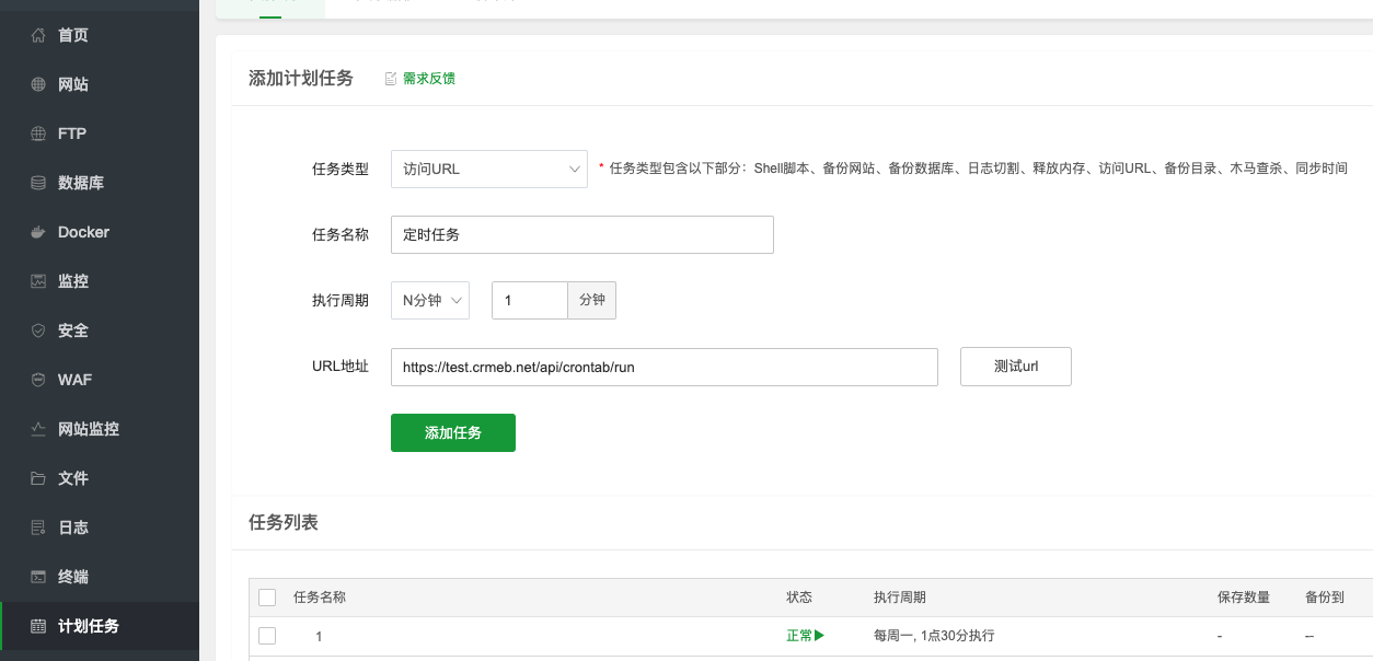 宝塔面板中,选择计划任务,添加访问url的计划任务,时间固定为一分钟访问一次,目标url为:您的域名/api/crontab/run