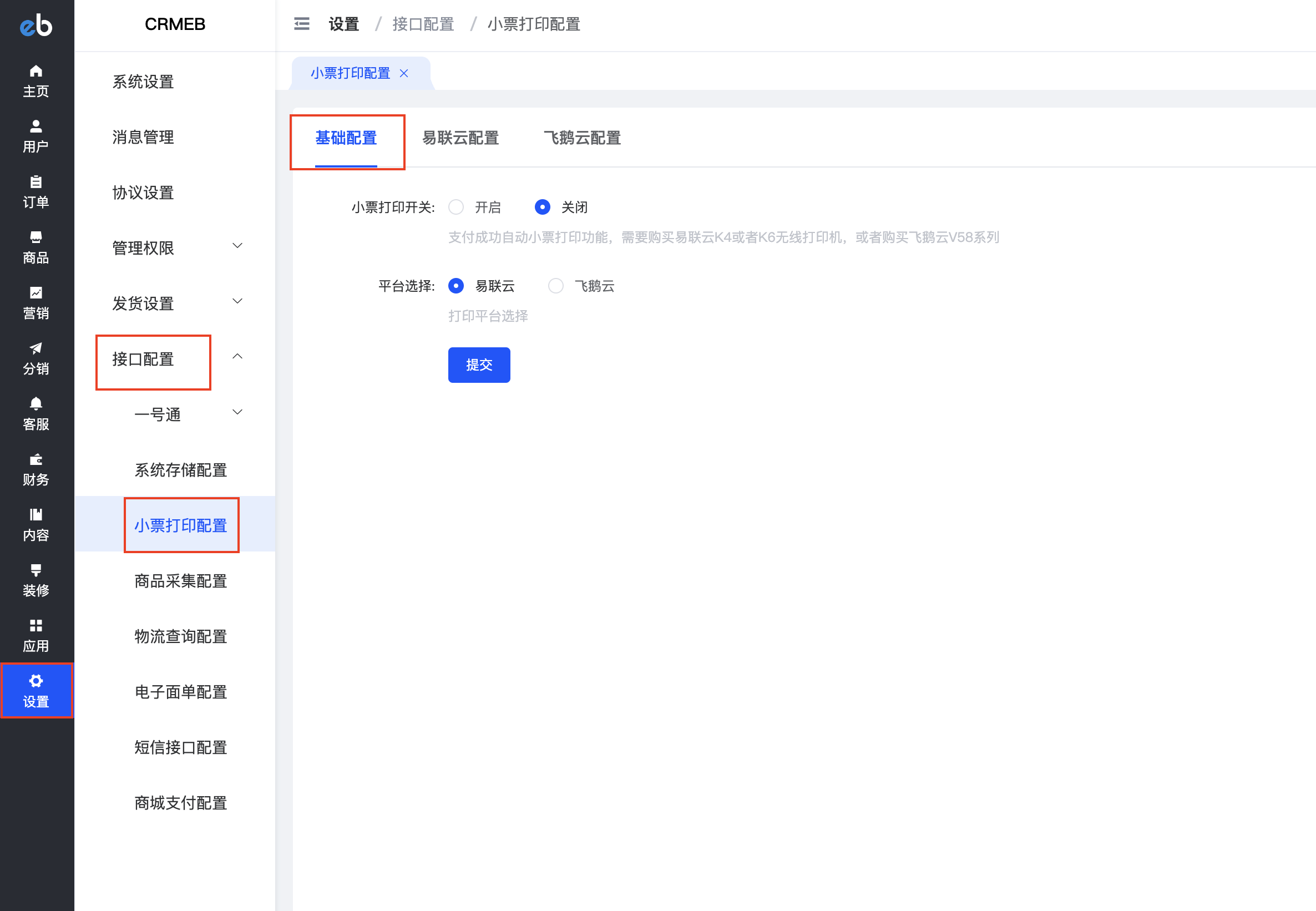 小票打印基础设置,可以选择打印机的开关和打印机的平台