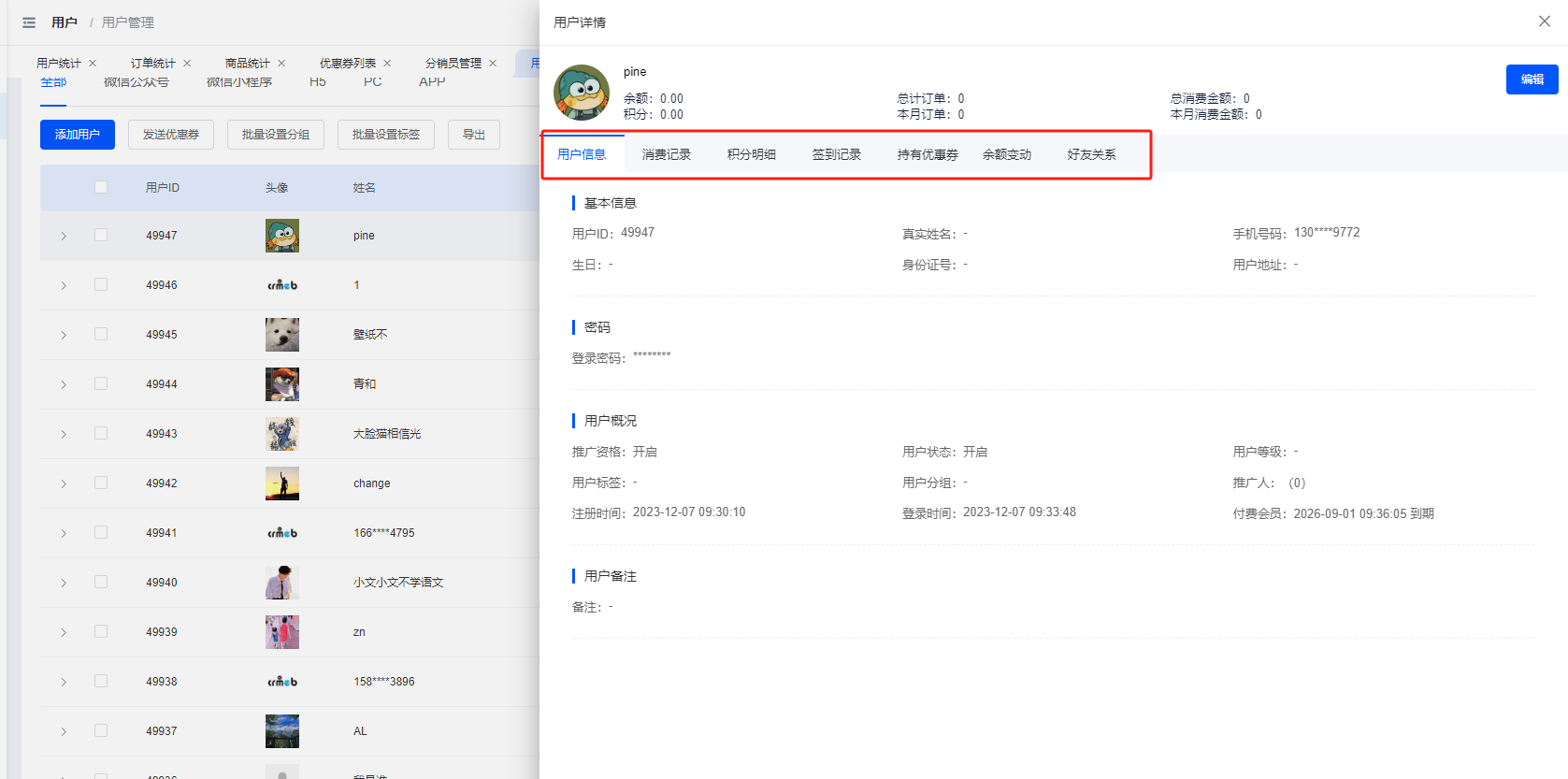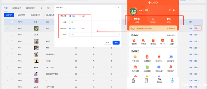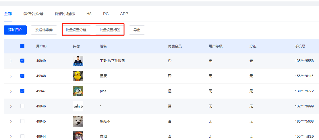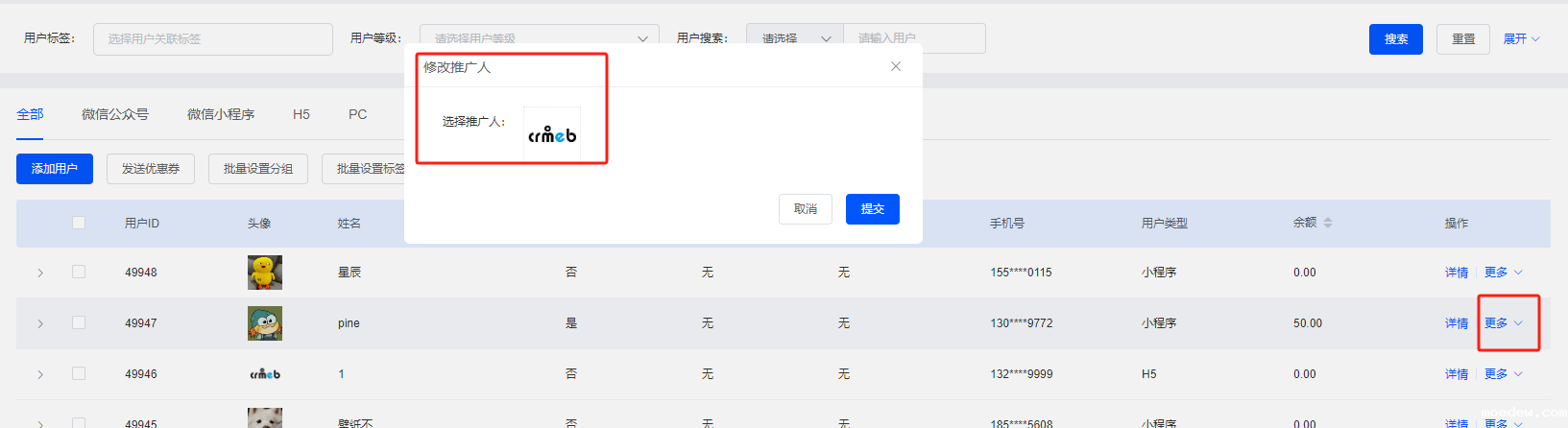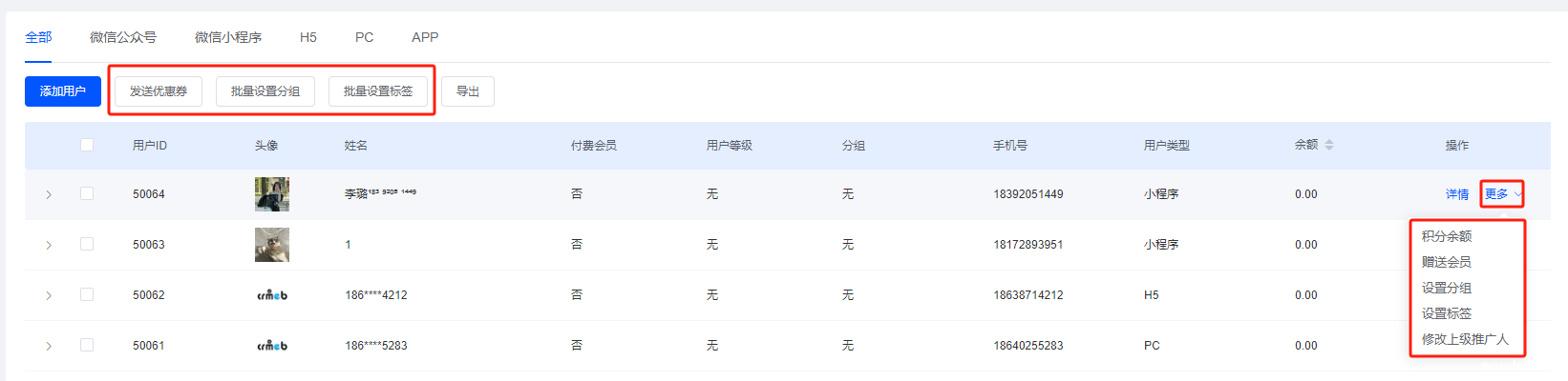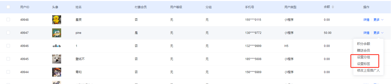 可以发送优惠券,批量设置分组,设置标签。用户列表最后的更多里面可以修改用户的积分、余额,单独设置分组标签,修改上级推广员等