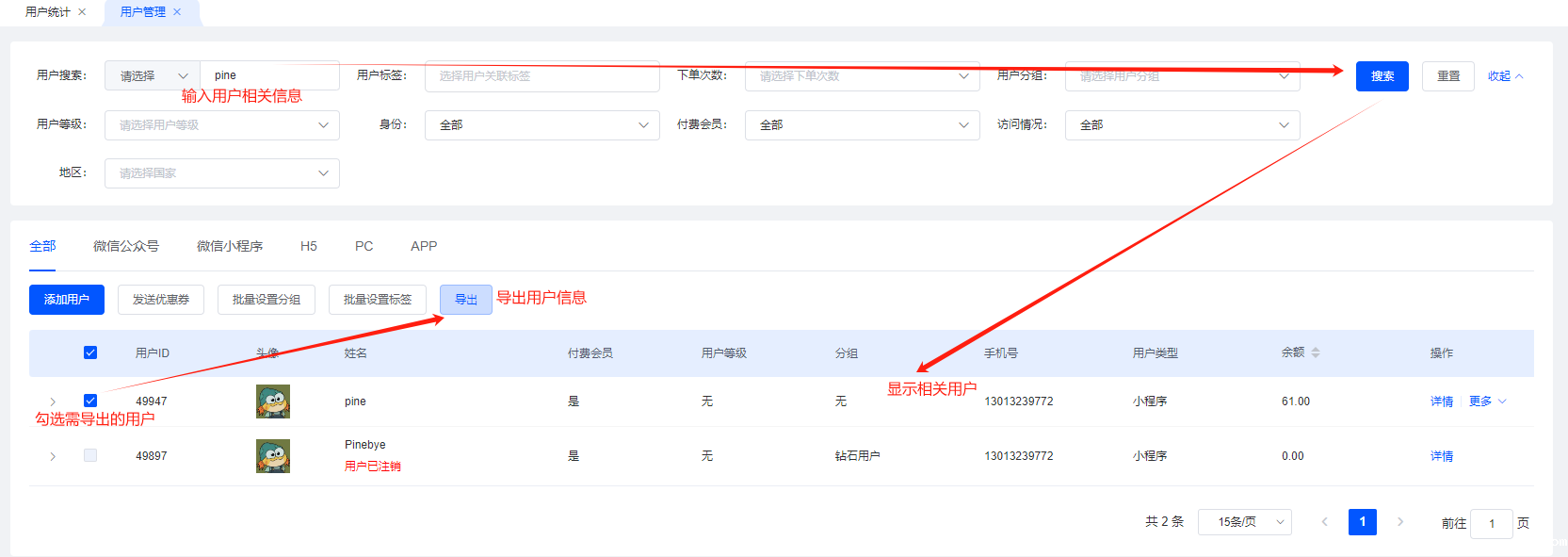 查看商城所有用户,支持通过用户昵称、手机号、用户UID搜索;支持用户数据批量导出;