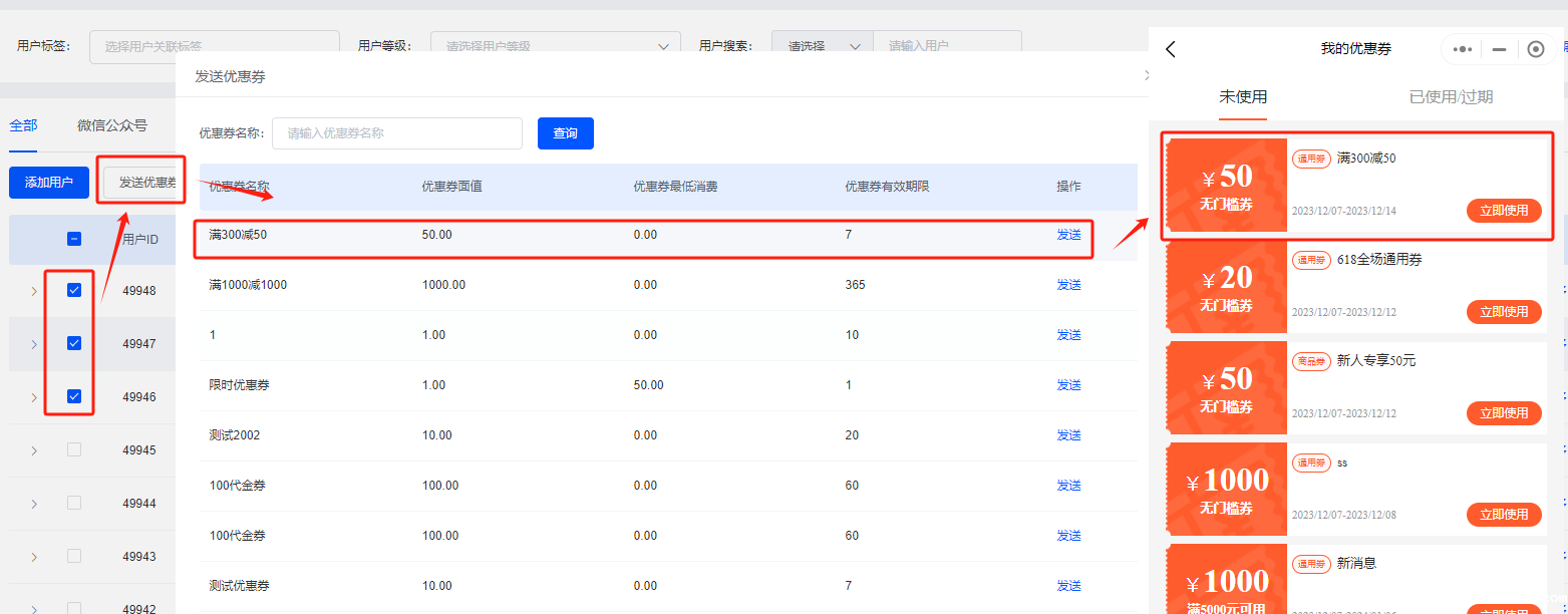 用户—>用户管理—>勾选用户(可多选)—>发送优惠券