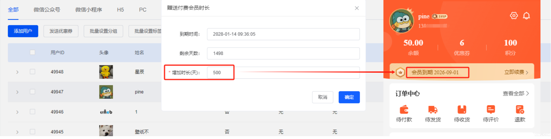 查看用户所持会员到期时间,剩余时长。可增加用户会员时长
