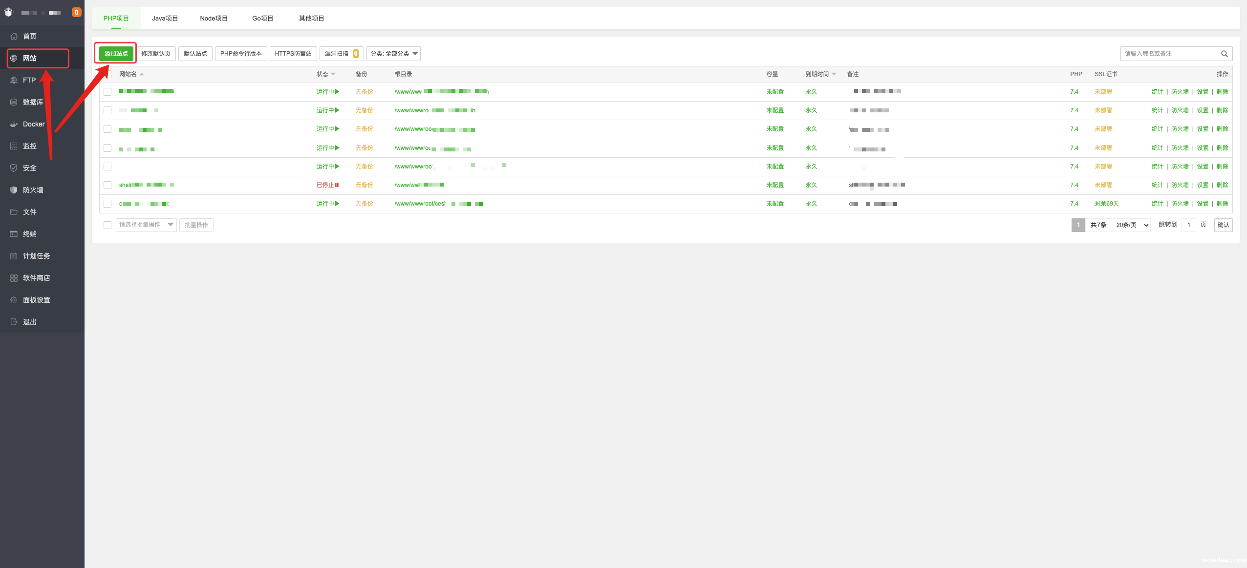 点击宝塔面板左侧菜单,选择网站,点击添加站点