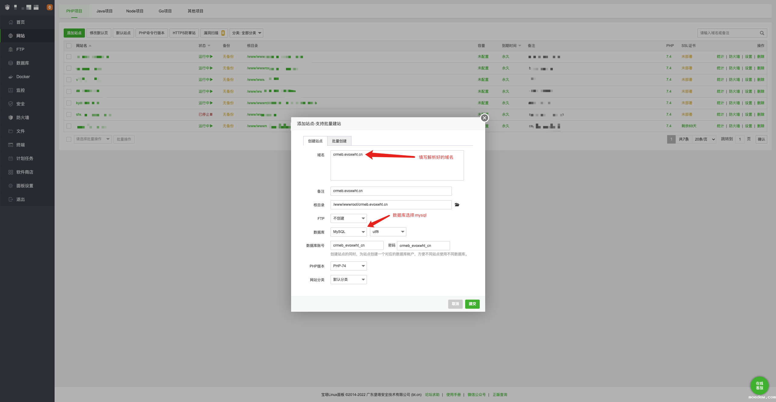填写解析好的域名,数据库选择mysql,php版本选择7.1-7.4中任意一个,填写完成点击添加,记录下创建完成时候生成的数据库信息