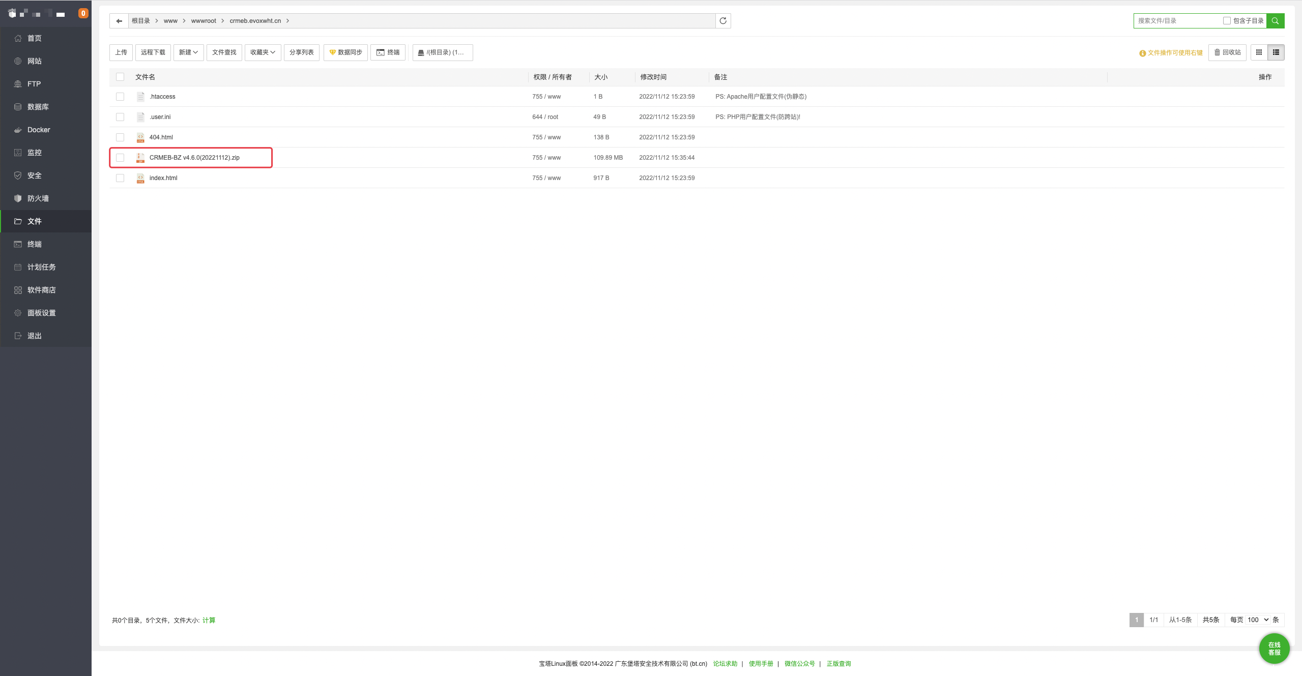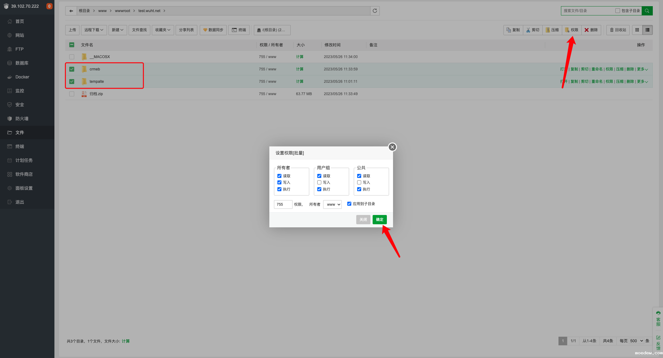 解压完成之后,直接给目录下的crmeb template这两个文件夹 755 www权限,选中crmeb template文件夹前面的多选框,有上角点击权限,设置755 www 权限,点击确定