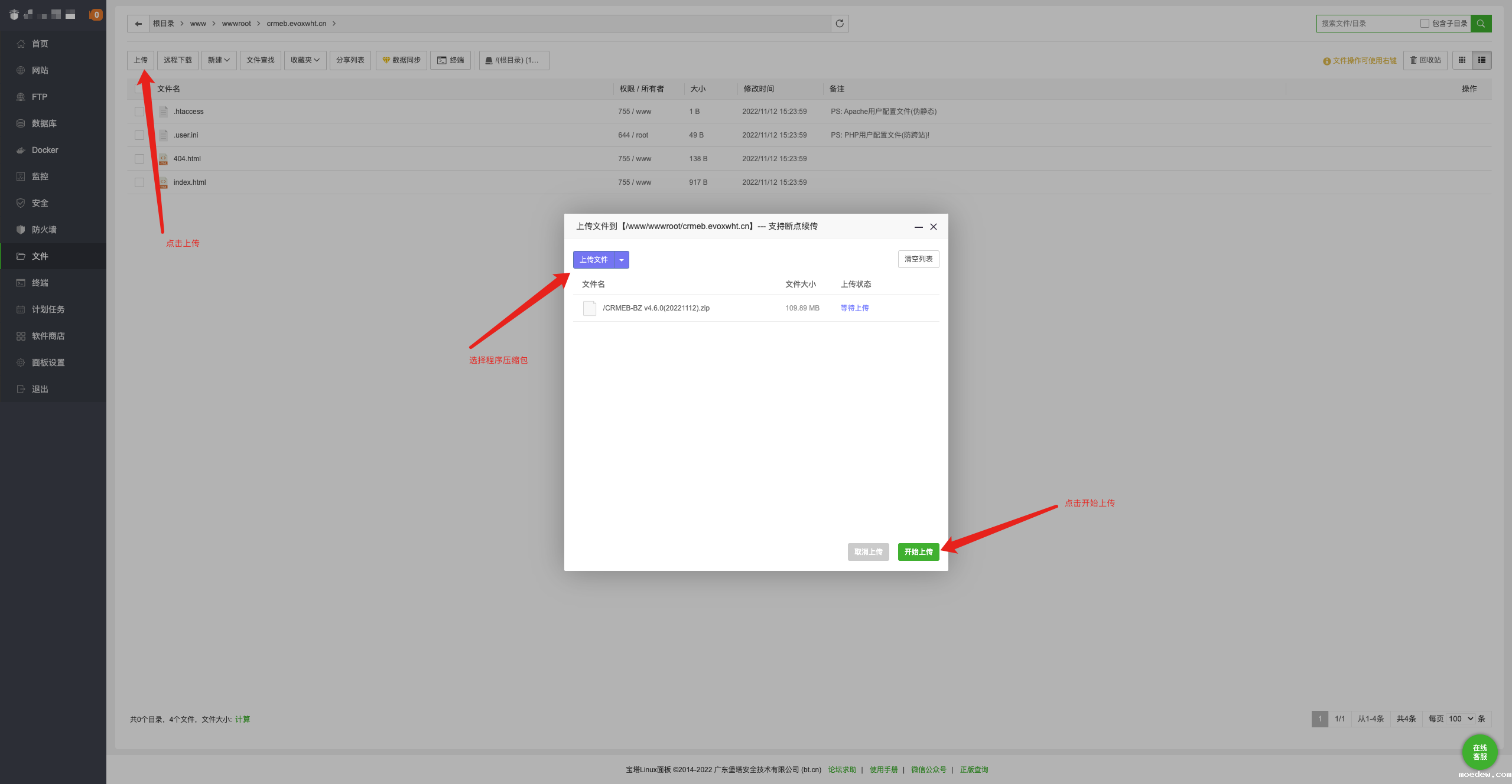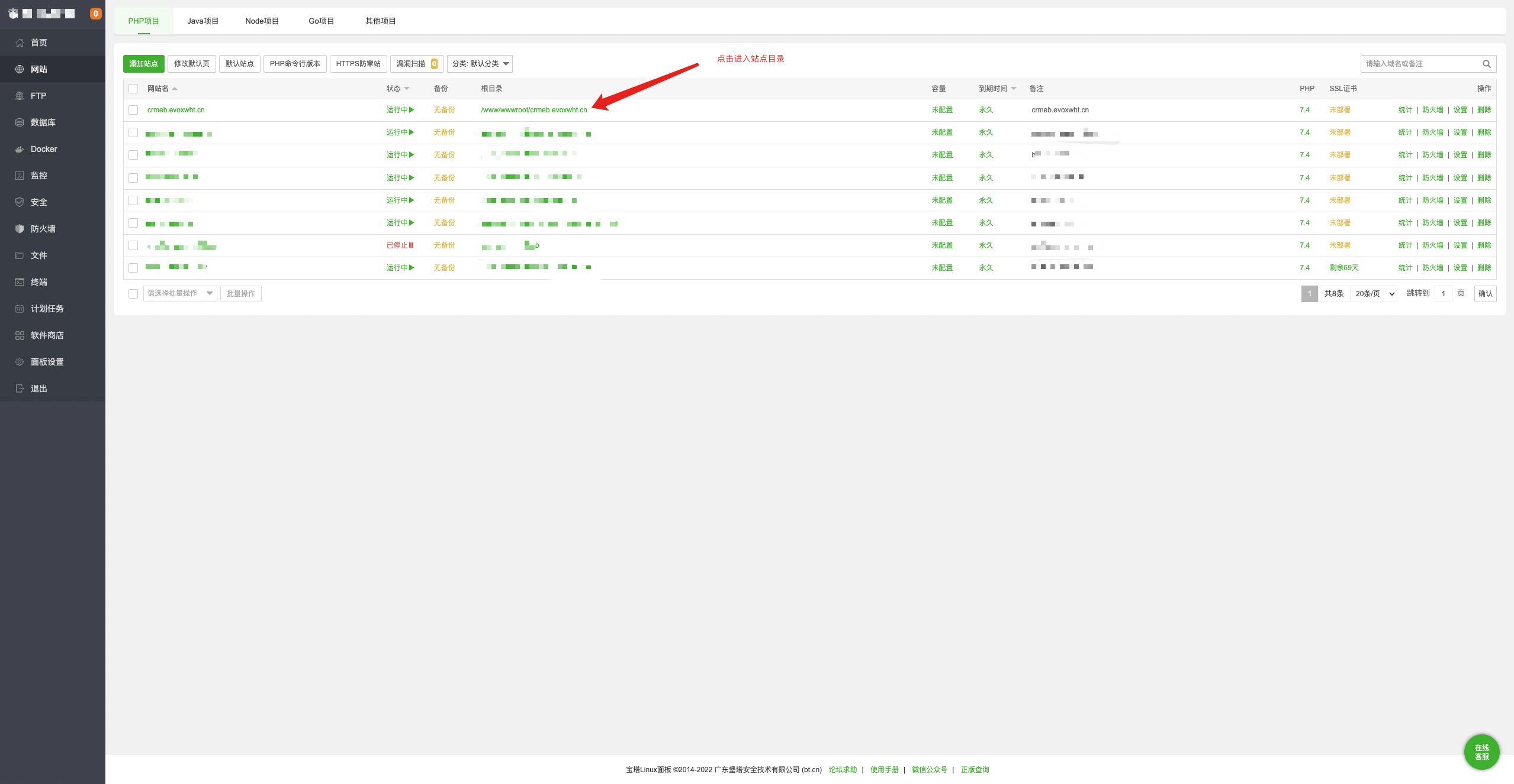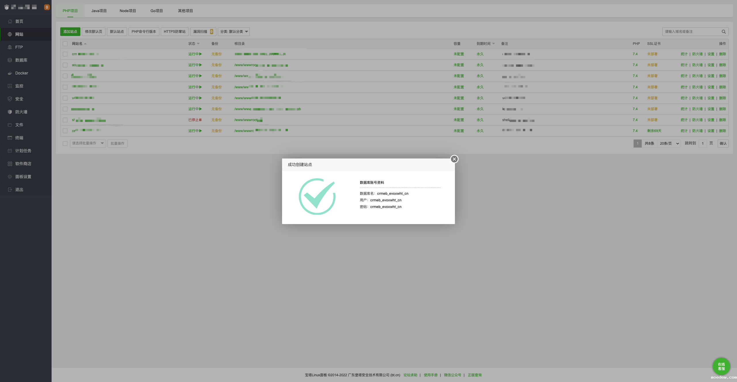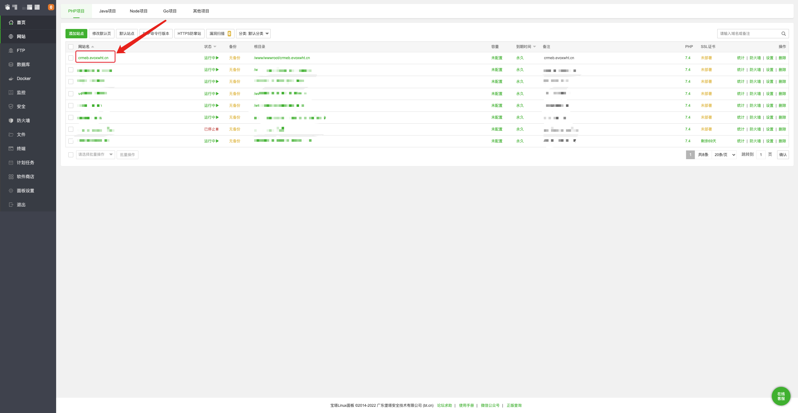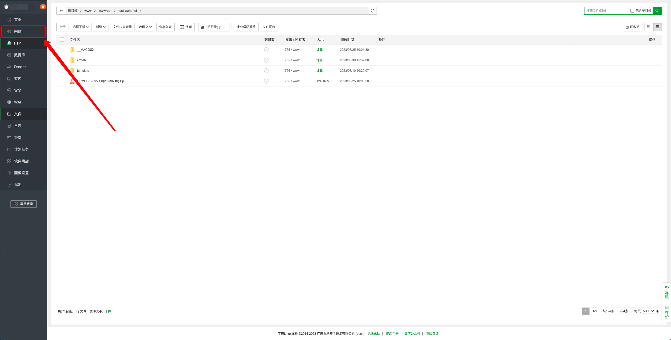 解压完成之后,点击宝塔左侧网站菜单,回到站点页面