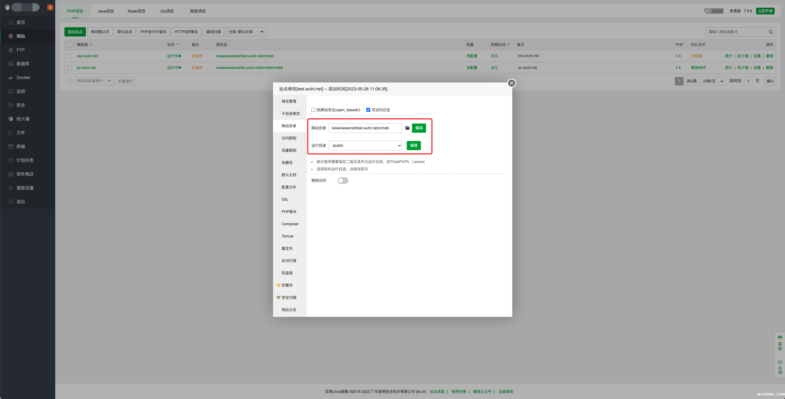 选择弹窗左侧网站目录菜单,修改网站目录为解压出来文件的crmeb目录,保存之后选择运行目录为public,点击保存